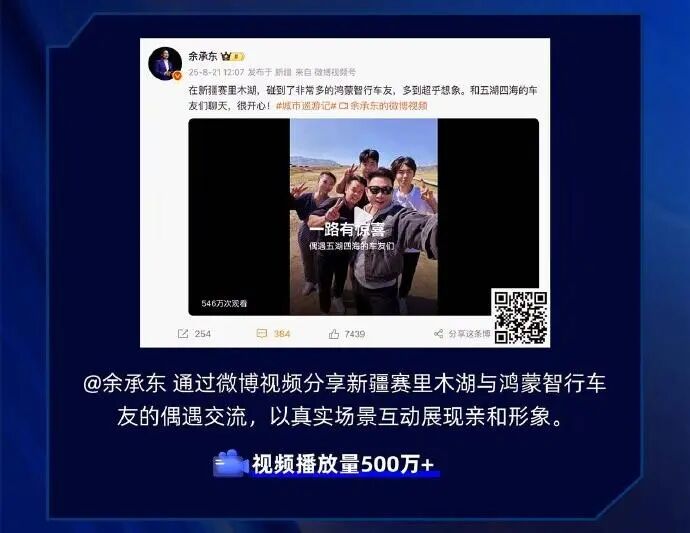 当代年轻人,对品牌的期待早已超越产品功能本身,他们寻求价值观的共鸣与情感的连接。而企业家、高管的社交账号,是将品牌从一个抽象的商业符号,降维成一个有温度、可触摸的“人”的最短路径。华为余承东就常在微博分享自己的试驾体验、参展实况、生活偶遇等,比如最近8月在新疆赛里木湖与鸿蒙智行车友的偶遇交流,以真实场景互动展现了亲和的形象。