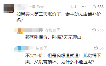 “客服没有正面回复,就说我们是可以7天内价保的,但是等做活动9号的时候已经过了7天嘛。”他无奈之下只能选择七天无理由退货,先把产品寄回去再说。