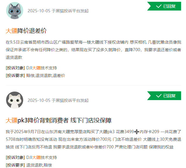 在黑猫投诉平台上,关于大疆产品降价的投诉也是接连不断,大家都希望能维护自己的合法权益。