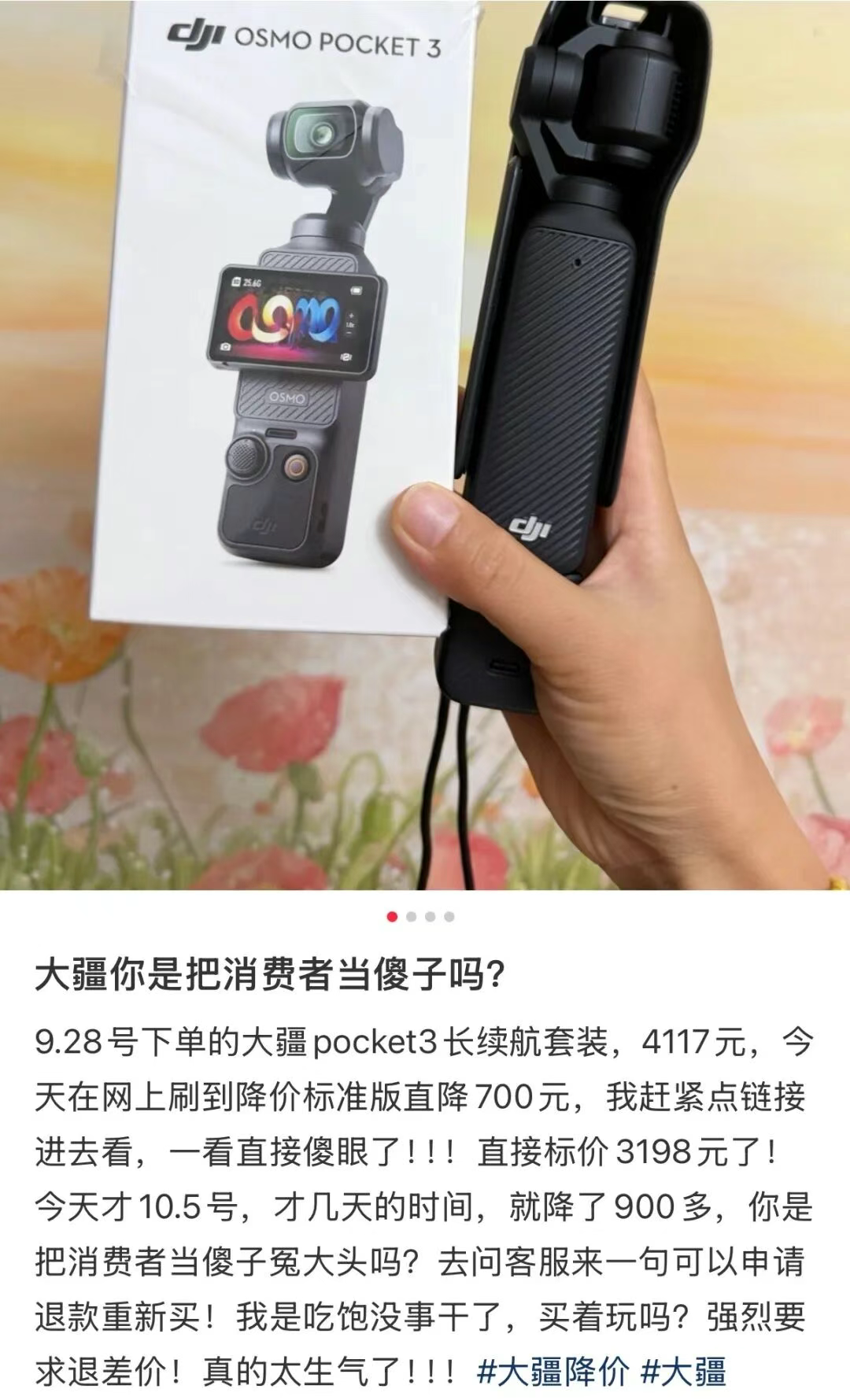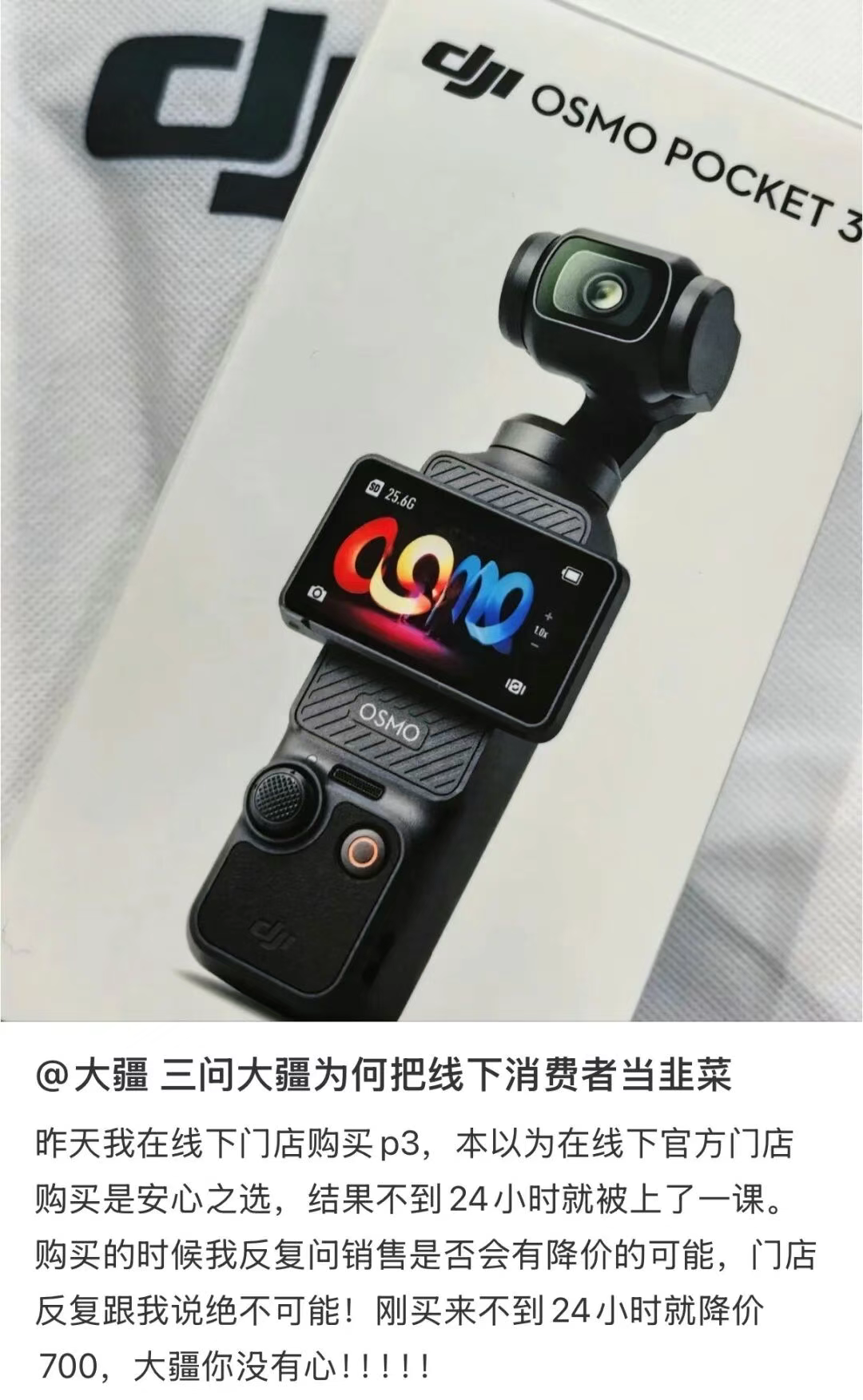 结果不到24小时降价消息传来,气到她发帖“三问大疆为何把线下消费者当韭菜”。