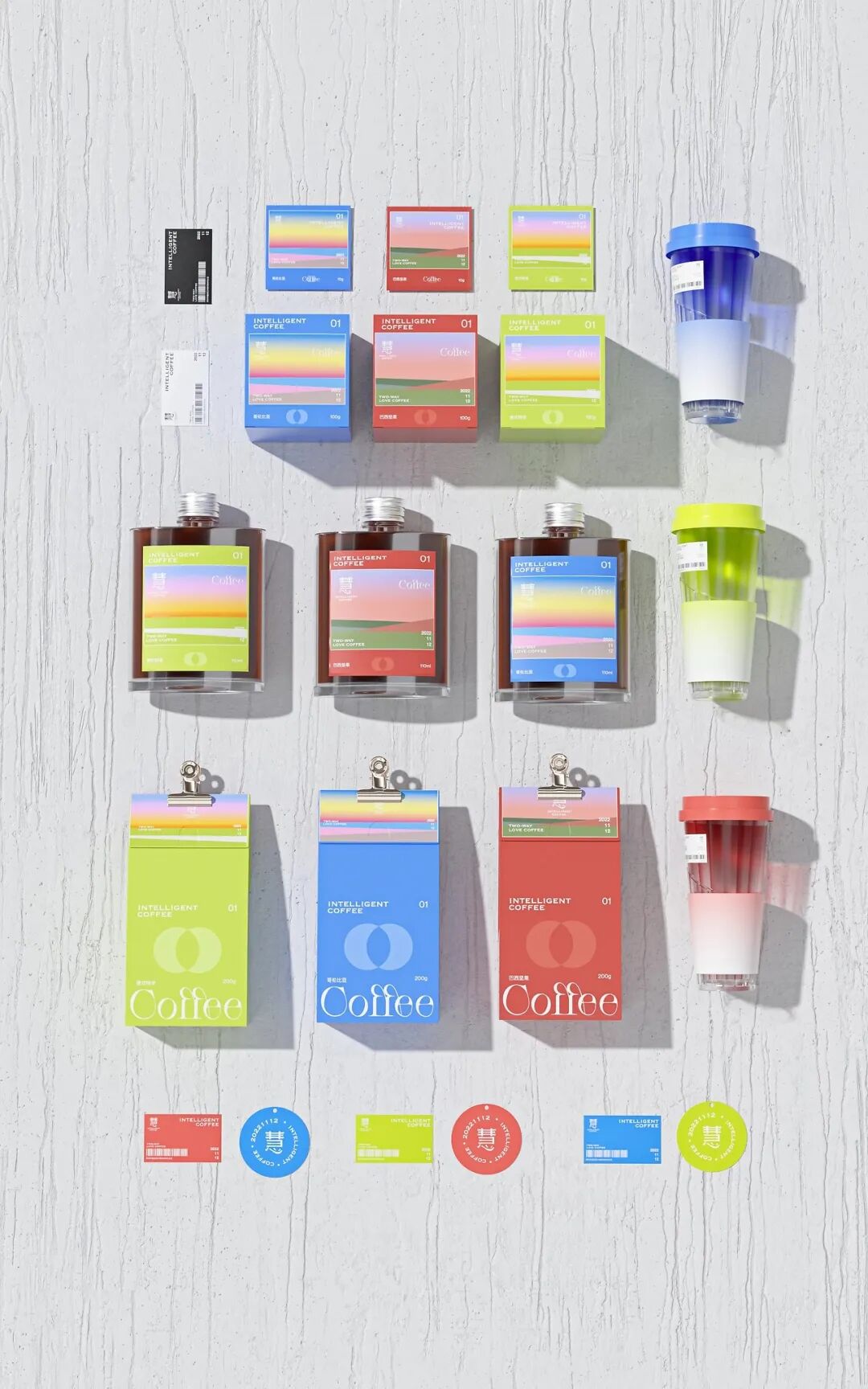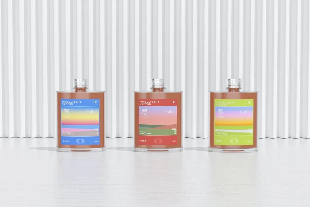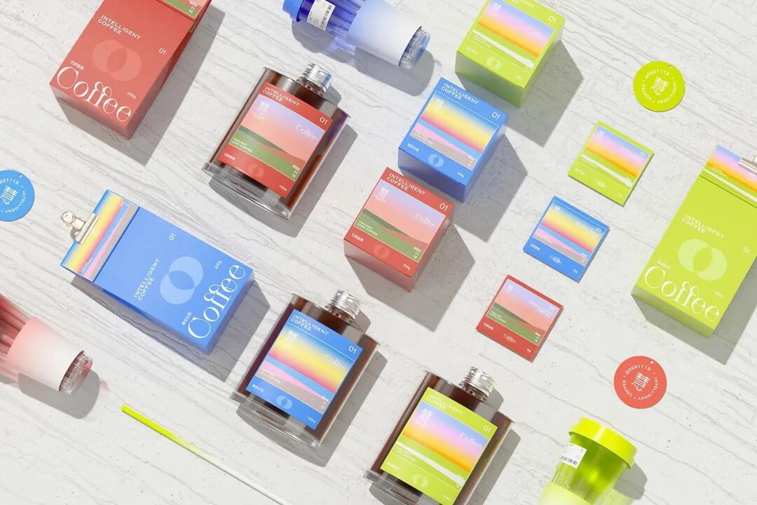 再看到这款故事感满满的咖啡,简直是把彩虹揉进了包装里。渐变的色彩从柔和的蓝到明媚的黄、热烈的红,像一场视觉的 “多巴胺派对”,瞬间抓住眼球。包装形式也很丰富,从盒装到瓶装,还有配套的色彩明快的杯子,打造出一整套的 咖啡美学宇宙,仿佛在邀请年轻人,“快来和我一起,用咖啡开启一场色彩斑斓的生活冒险。”
