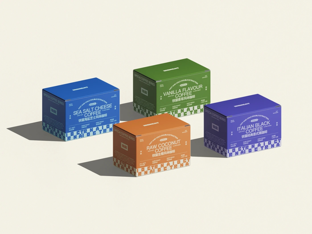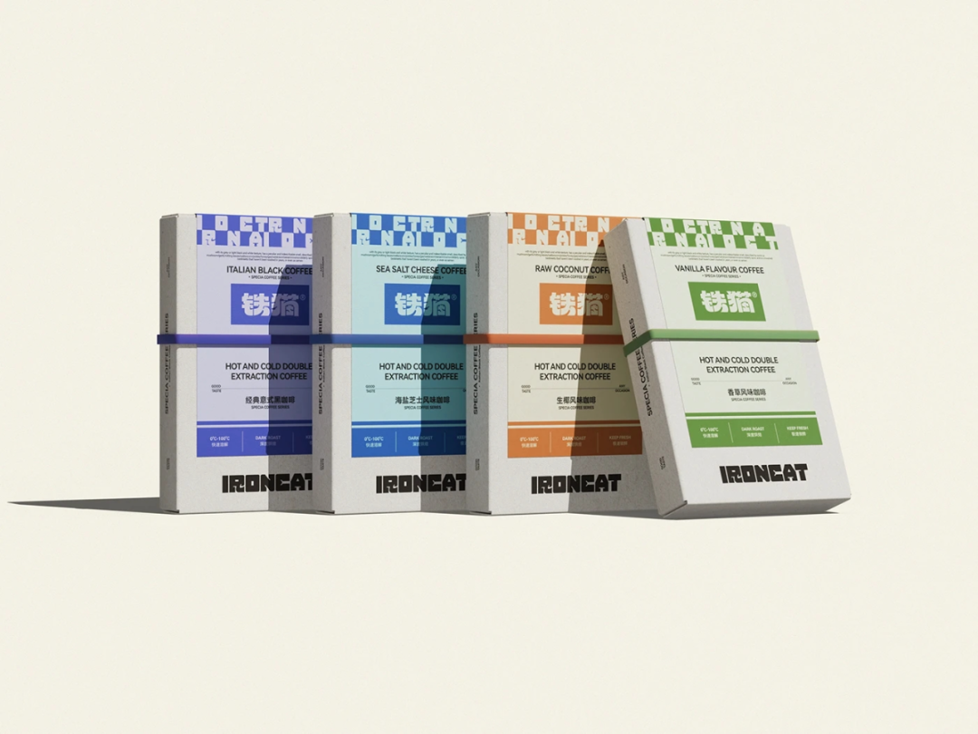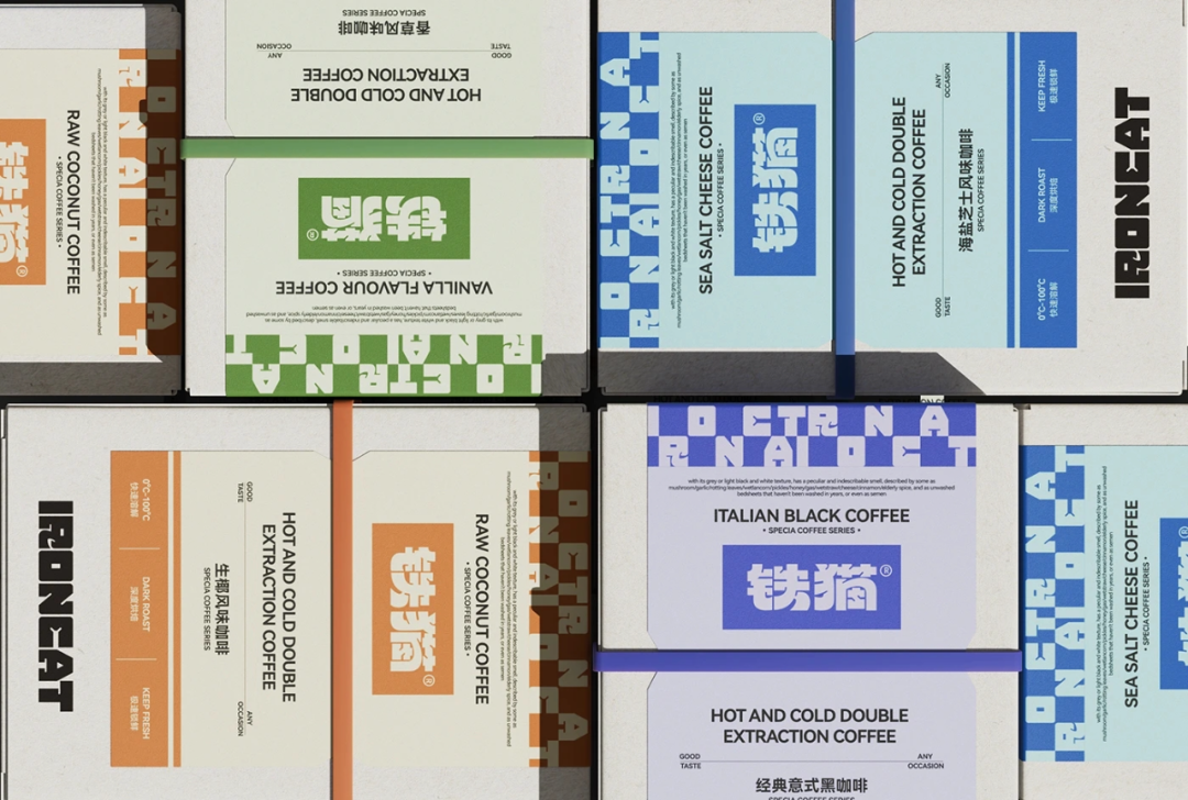 因此设计理念上抛弃复杂的图形画面,将品牌名称以平面构成的形式组合为辅助图形,通过明快的色彩搭配与简洁现代的版式布局,将铁猫的品牌形象转化为为独特的视觉风格,用设计去传递品牌感性的内在价值。不同口味的包装用鲜明又和谐的色彩区分,香草味的清新绿、海盐芝士的清爽蓝、生椰的温暖橙,每一种色彩都精准 “戳中” 对应口味给人的味觉联想,几何图形与文字的组合,带着点复古又新潮的腔调。