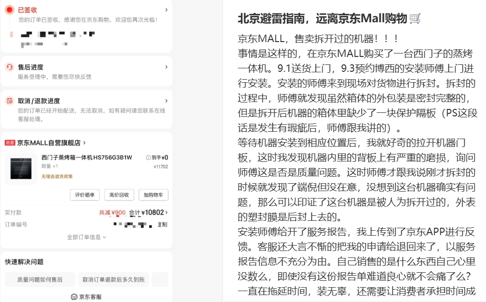 还有很多网友在社媒平台发布了“踩坑”经历,吐槽京东MALL和京东官方客服来回推诿扯皮,导致售后体验极差,并质疑京东MALL和京东的服务不是一回事。