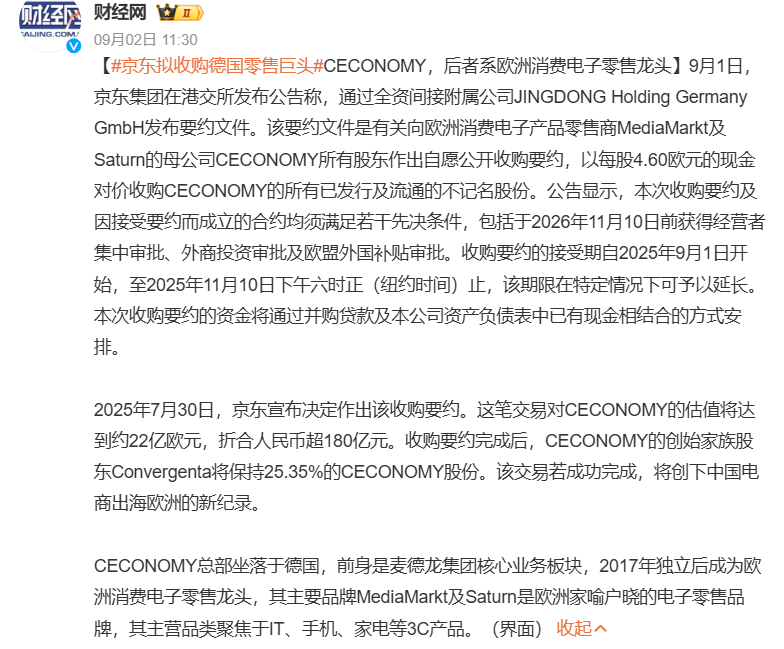 今年7月,京东向欧洲消费电子零售龙头企业CECONOMY发出收购要约,对其估值近22亿欧元,目前已获德国监管机构批准。刘强东今年曾公开表示,国际业务是京东未来最重要的发展重点之一,如今京东在欧洲的基建已完成大半,大约明年能开始营业。