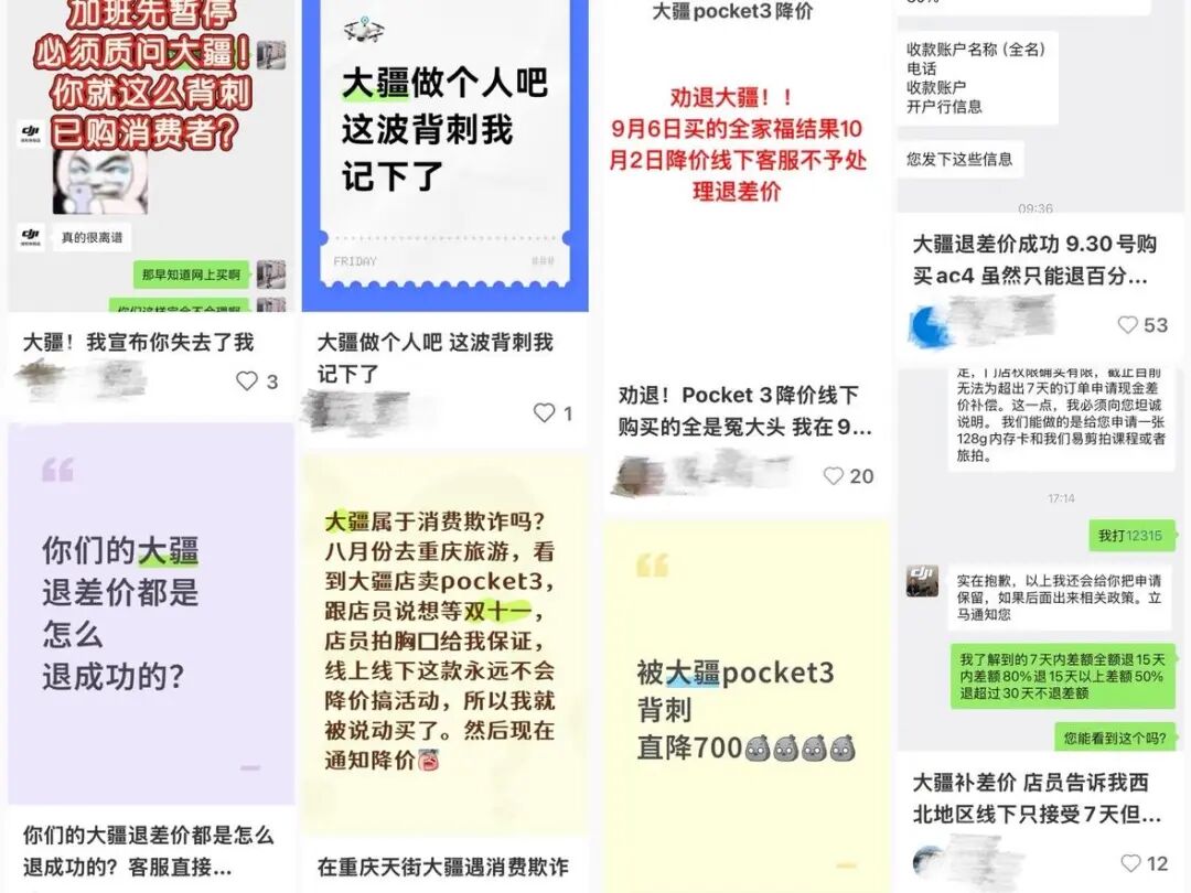 在小红书上,像冰冰这样的消费者还有很多。10月9日开始的这波降价,恰好让许多在9月底为国庆出行而购机的用户,错过了“7天价保”的期限。“大疆把消费者当傻子”等话题在小红书上发酵,引发热议。