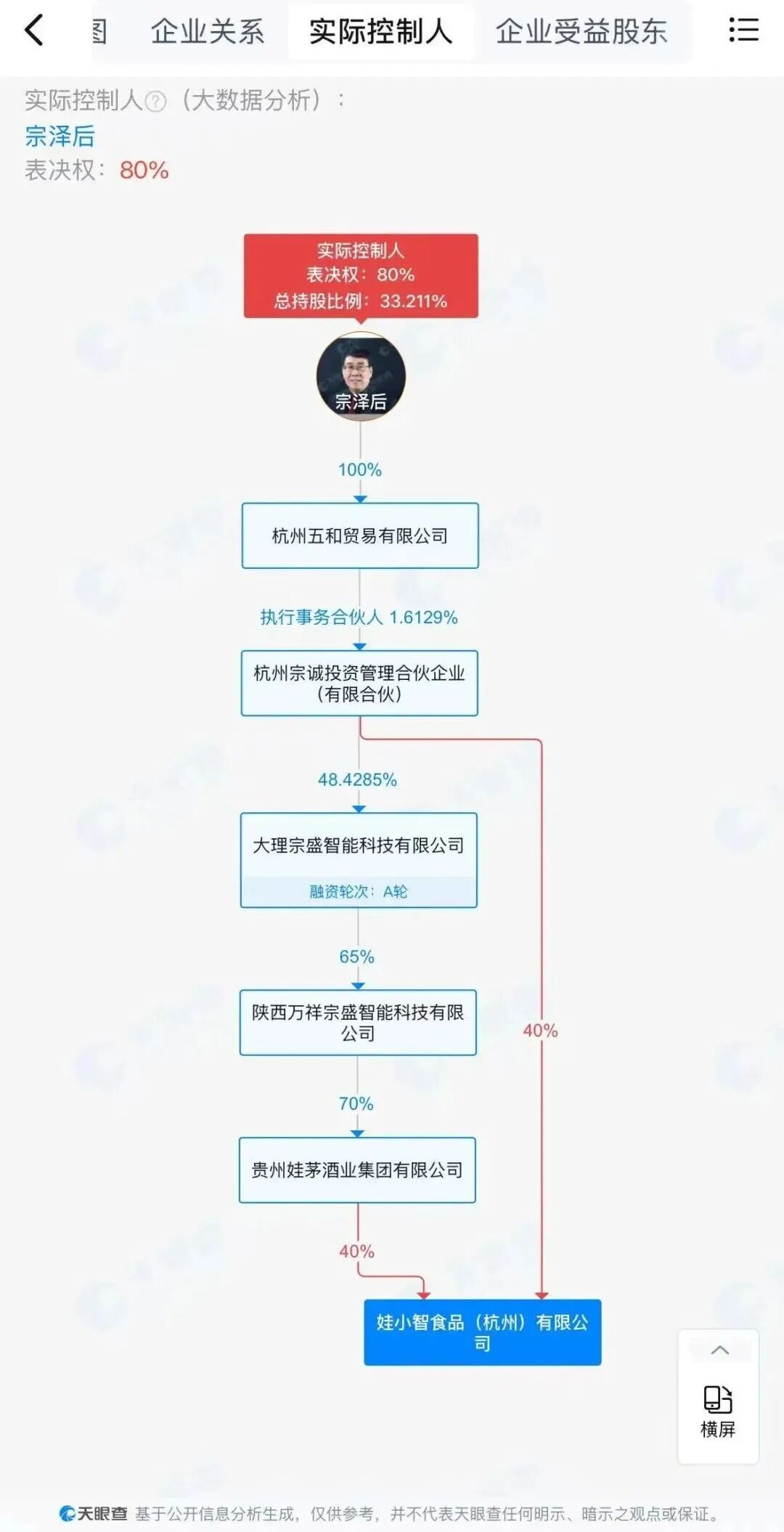 宗泽后通过贵州娃茅酒业集团有限公司等间接持股33.211%,为实际控制人。