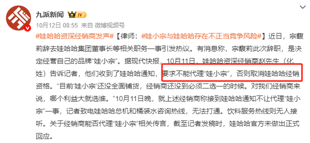 有消息称,娃哈哈资深经销商已经收到了来自娃哈哈的通知,要求不能代理“娃小宗”,否则取消娃哈哈经销资格。