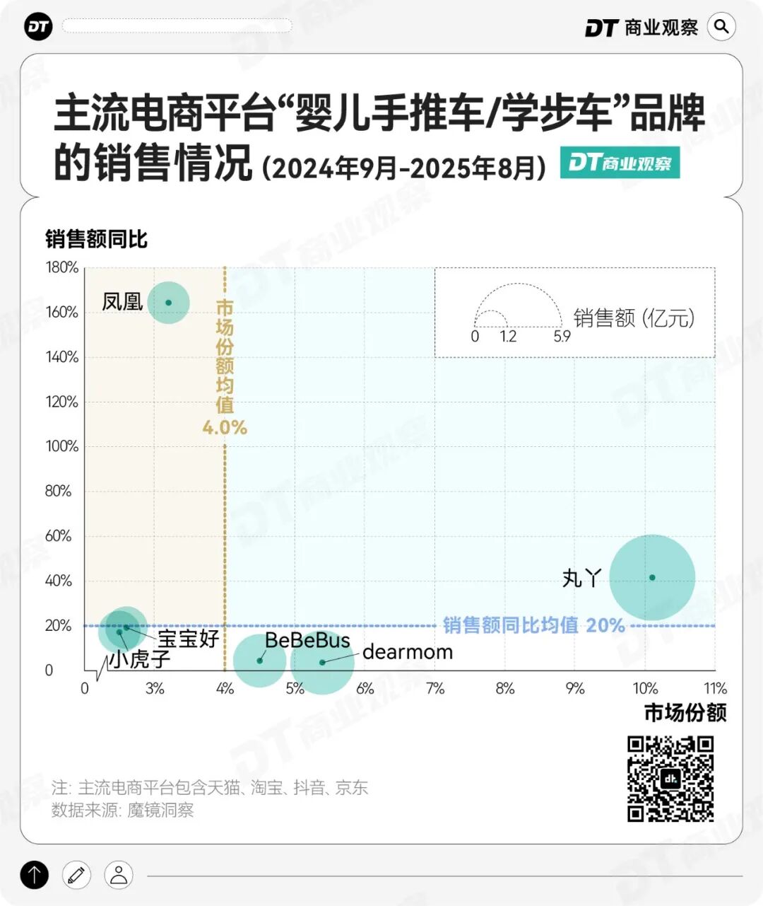 魔镜洞察显示,在近一年主流电商平台“婴儿手推车”的品牌销售中,出现了高市占率的品牌,也有增速很快的玩家。