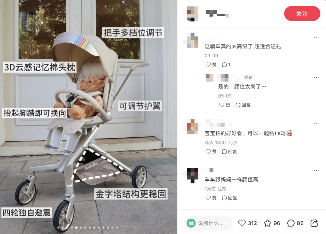 BeBeBus把“外观美学+护脊需要”放到突出位置,打动了不少小红书精致妈妈人群。