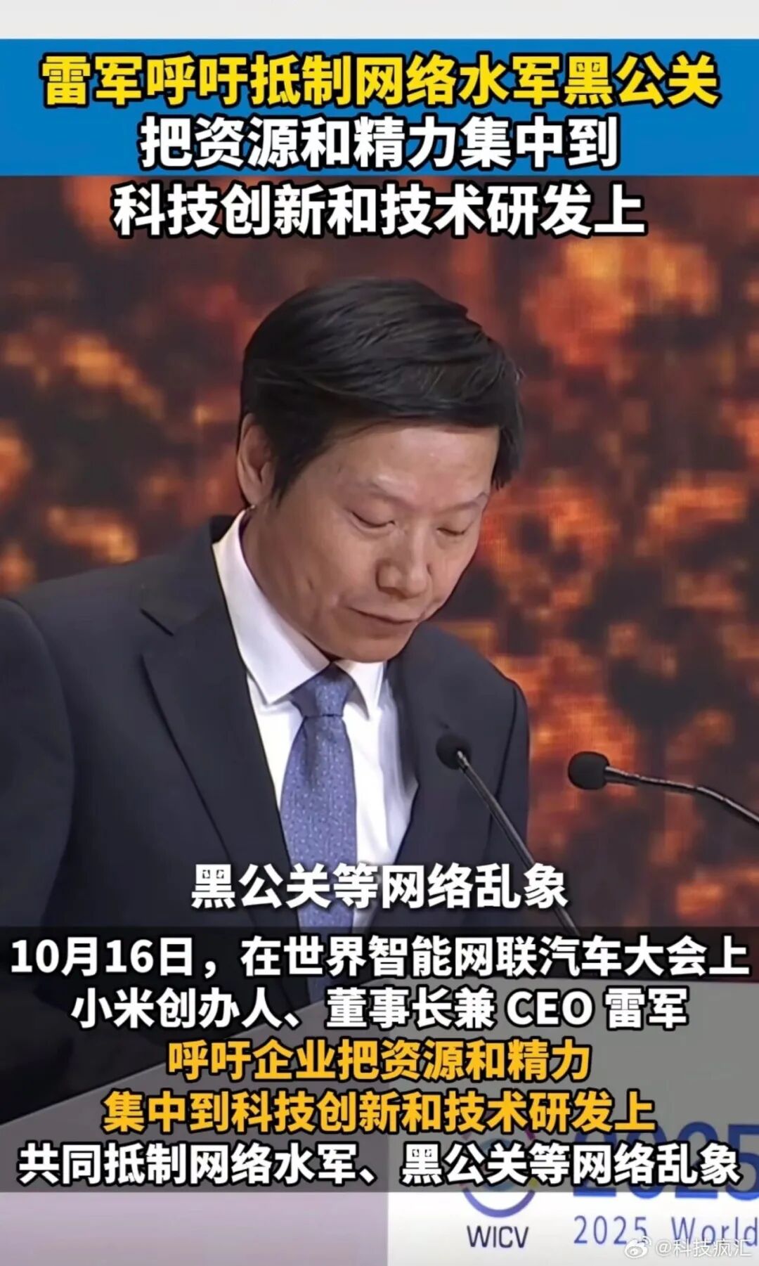 昨日,雷军在2025智能网联汽车大会上应邀发声,期间提到要“共同抵制网络水军黑公关等网络乱象,一起营造积极向上文明有序的产业发展环境。”