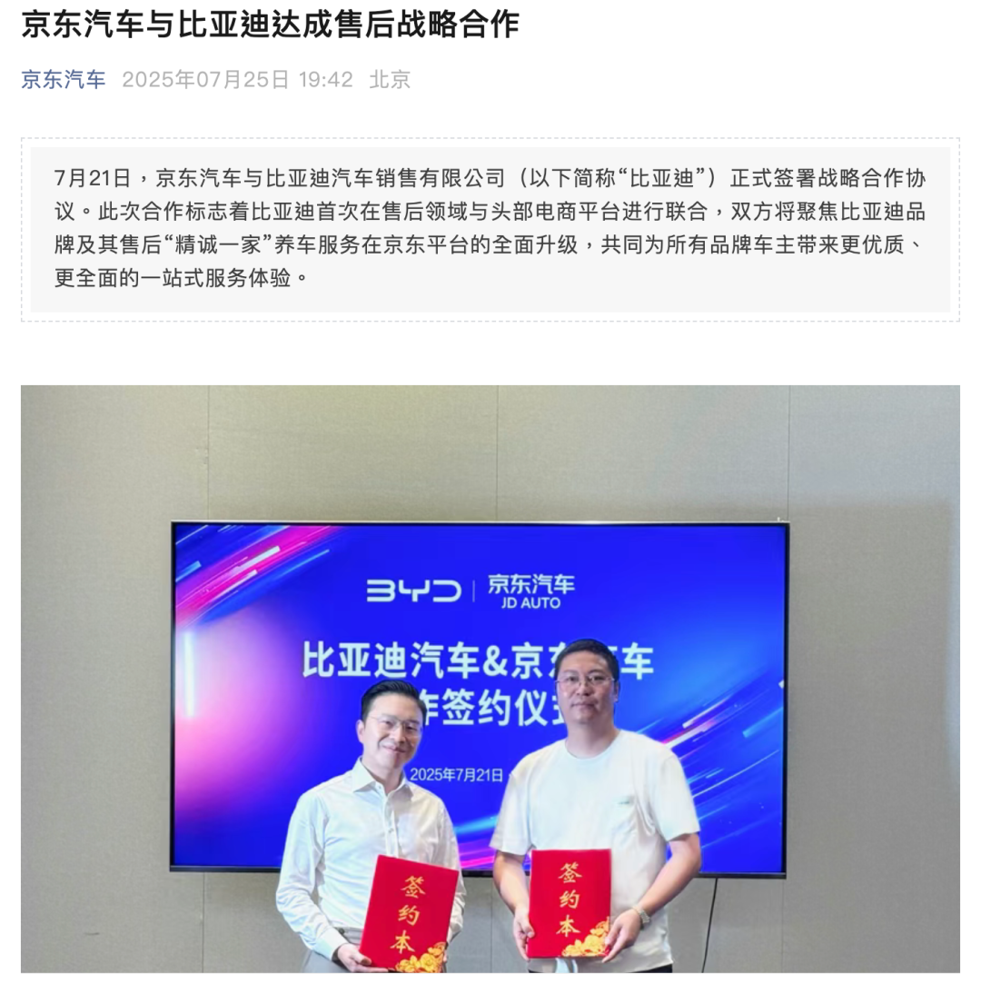 7月,京东汽车与比亚迪签署战略合作,成立“比亚迪售后官方旗舰店”,提供原厂保养、配件及到店安装、上门取送车等一站式服务。
