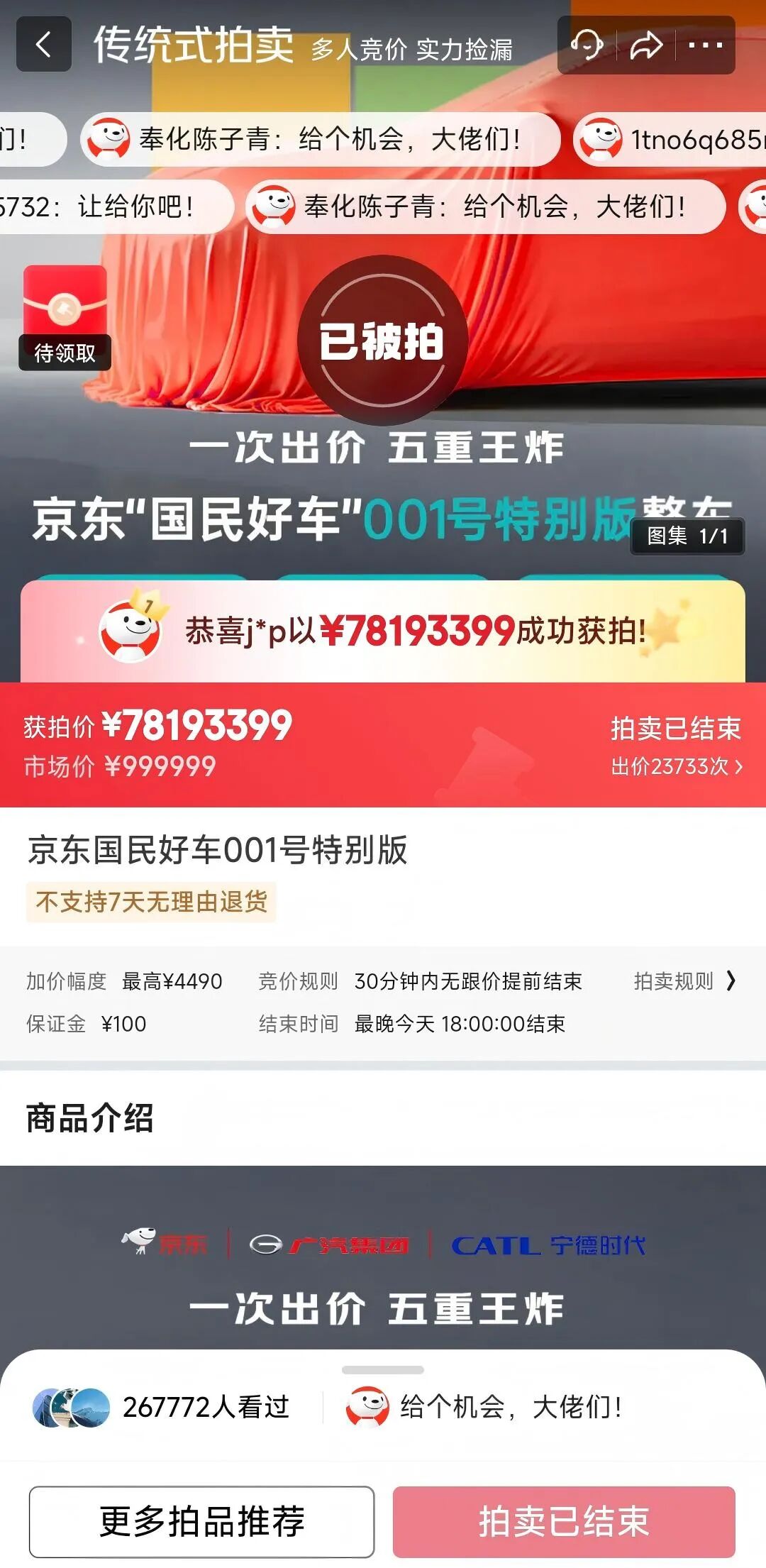 与此同时,京东汽车“001号特别版”的归属将由拍卖产生,起拍价仅1元,最终价格全由车主自己说了算。