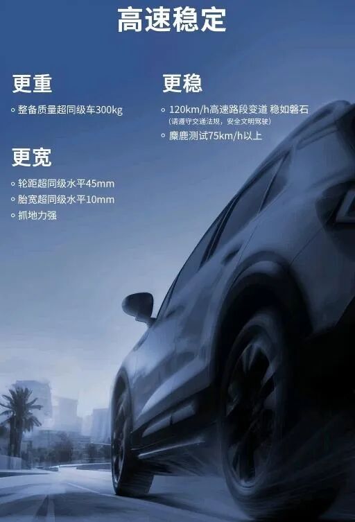 性能层面,该车的整备质量比同级车型重300公斤,轮距宽于行业45毫米、胎宽多出10毫米;