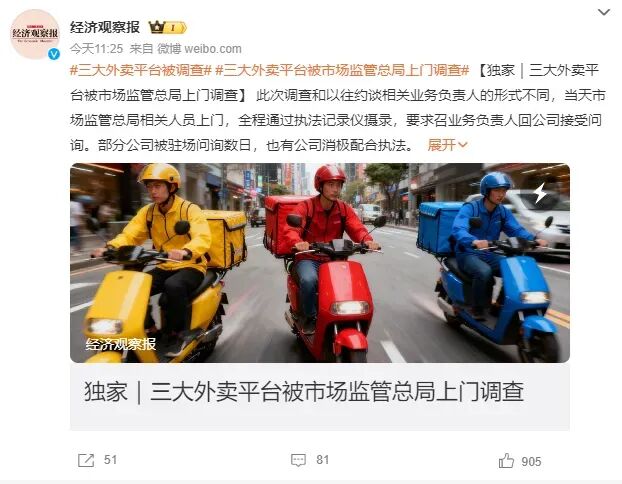 今天(10月24日),有媒体报道称,从多个信源处获悉,10月中旬,京东、美团、饿了么等公司于同一天被国家市场监督管理总局调查,事涉食品安全、外卖平台对商家经营资质审核等问题。