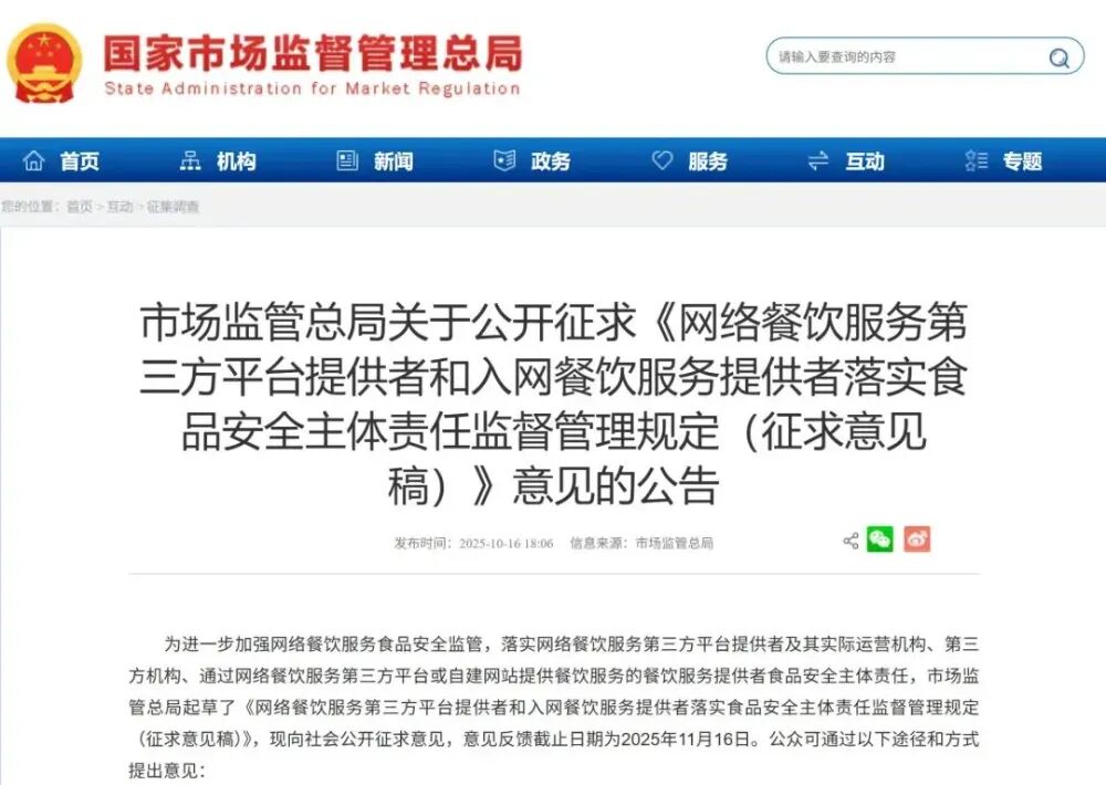 值得一提的是,10月16日,市场监管总局正式发布《网络餐饮服务第三方平台提供者和入网餐饮服务提供者落实食品安全主体责任监督管理规定(征求意见稿)》,这几乎可以看作调查的政策延伸。