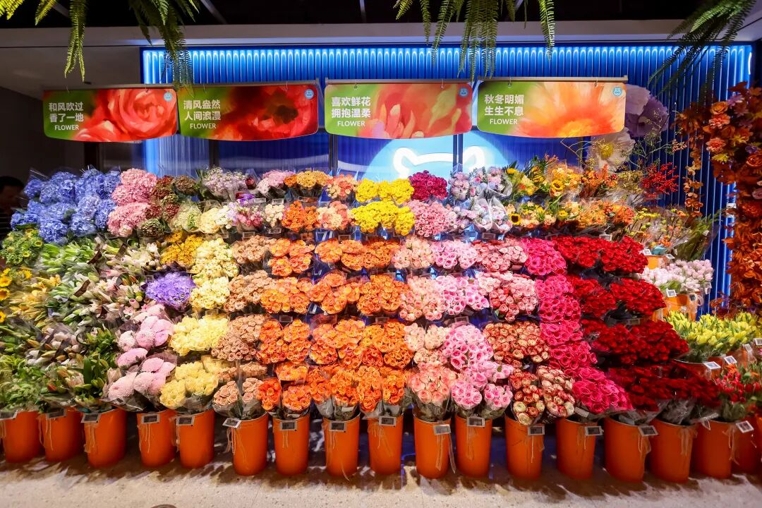 走进新店,笔者首先被盒马在入场门口设置的鲜花区所吸引,近来深圳随不如寒潮,但盒马的鲜花区则温存着春意。