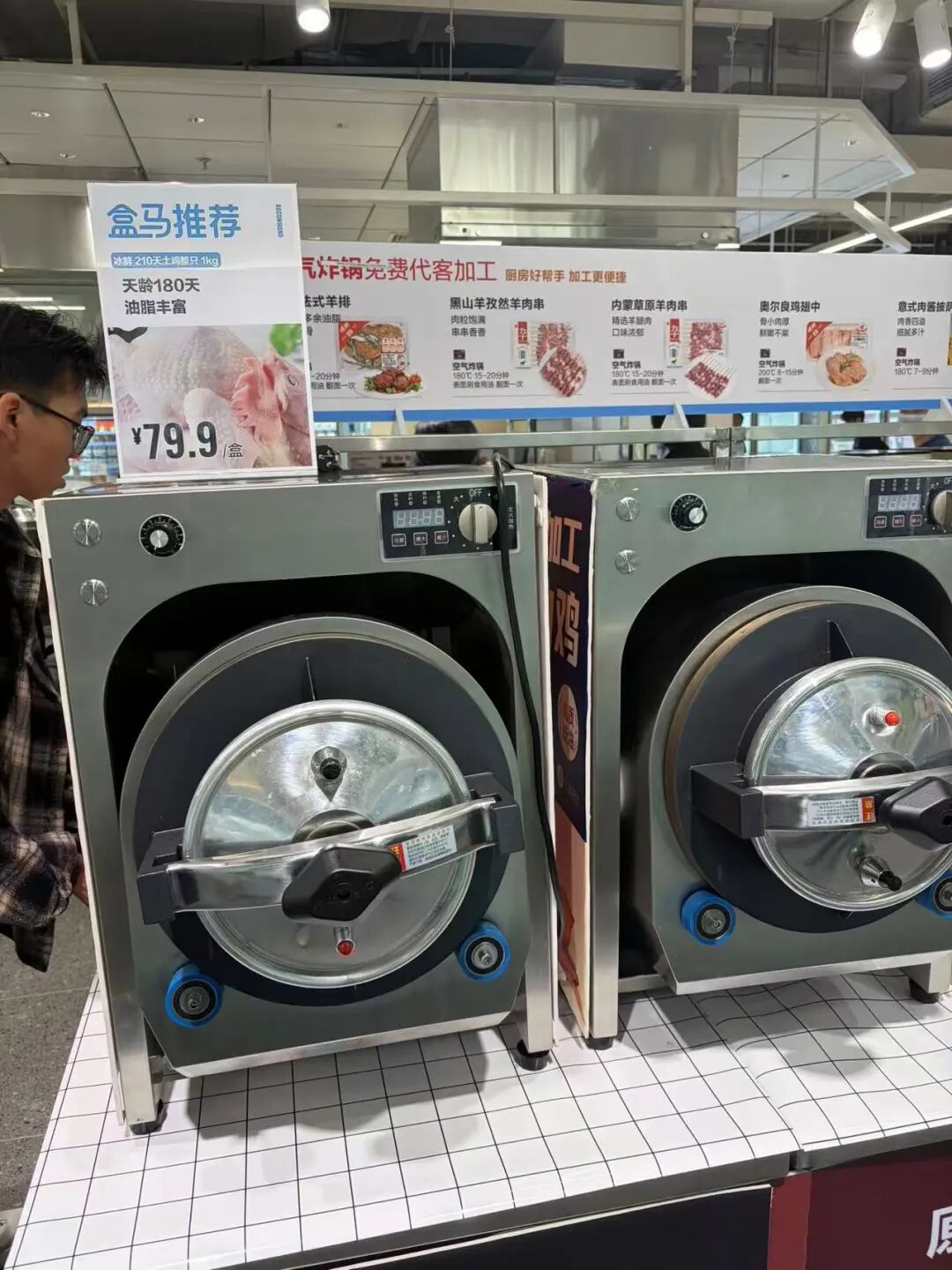 新店还为火锅爱好者提供了专属的火锅菜品,以及盒马为因应周边居民消费结构,推出了“叮”系列快捷商品,鲅鱼水饺、墨鱼水饺、羊肉串、土鸡、羊排、奥尔良鸡翅等等,都可以在盒马现场加工后即时享用。