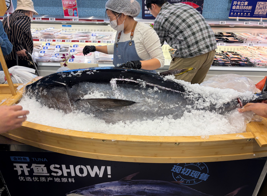 开业首日,店内还举行了蓝鳍金枪鱼开鱼仪式,引来不少市民朋友围观。现场开鱼后,消费者就可以品尝到来自深海的紧实肉质。