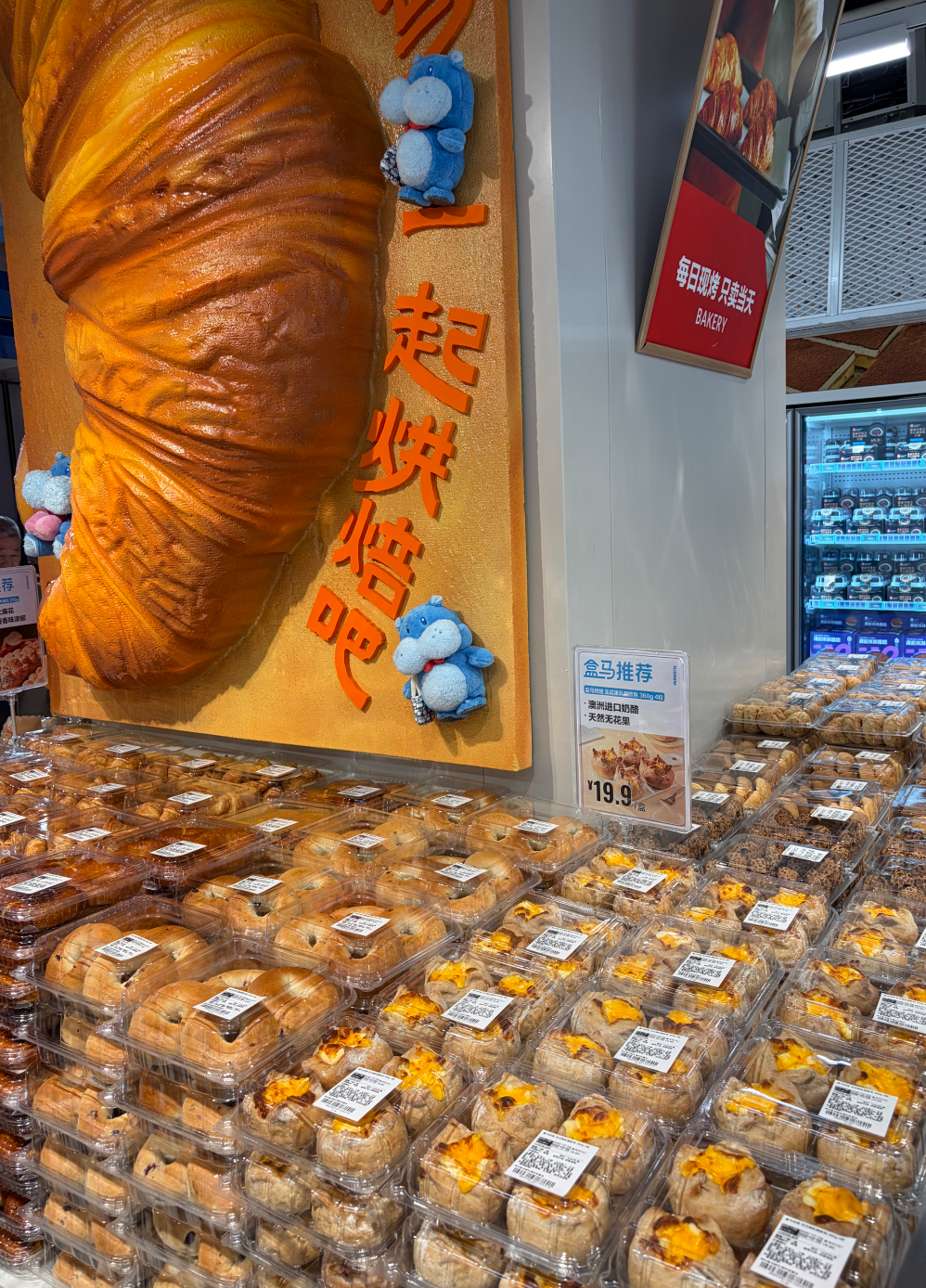 来到烘培区,盒马的多个爆品也出现在梅林店内,像是吐司、脆皮巧克力开心果树莓大福、五谷丰登三明治、树莓酪酪贝果面包、盒马瑞士卷等等,盒马梅林店的到来是广大“碱水脑袋”的福利。