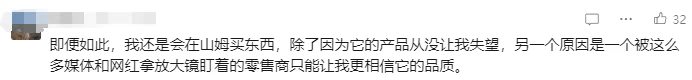 还有会员出于逆向思维,给出了选择山姆的理由:一个被这么多媒体和网红拿放大镜盯着的零售商,只能让我更相信它的品质。