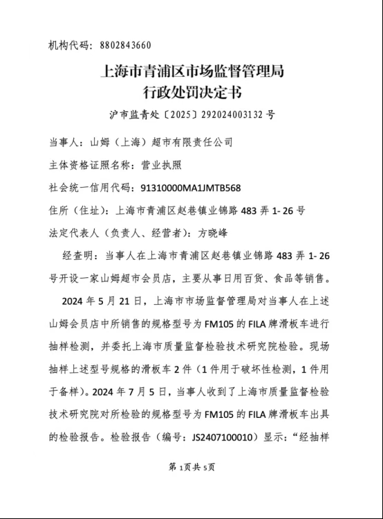 山姆(上海)超市有限责任公司因销售不合格FILA牌滑板车和兰精天丝儿童三件套,被罚没1.9万余元。