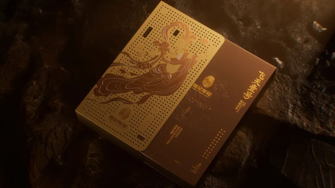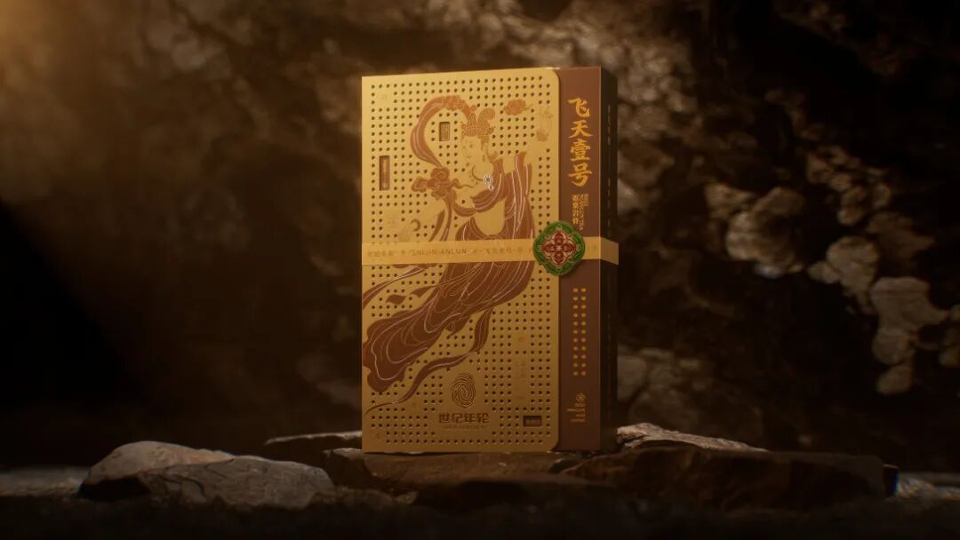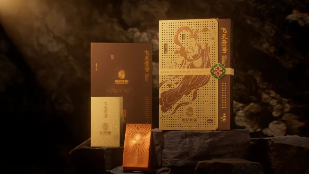 “世纪年轮” 等标识与飞天图案相互映衬,彰显出品牌的独特性,为包装增添了一丝现代感与时尚气息。整体设计将经典的文化符号进行创新表达,让传统艺术在茶叶包装上焕发出新的生机,契合了当下消费者对文化与美学融合的追求。