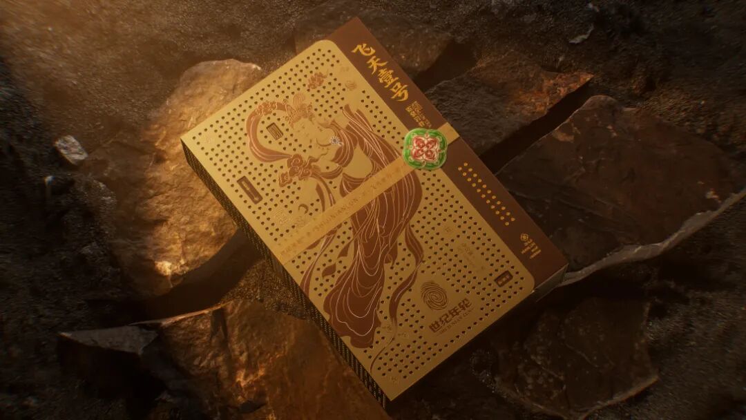“飞天壹号” 茶叶包装,创意聚焦于文化符号的现代演绎。包装以金棕为主色调,传递岩茶韵味与华贵,并选取敦煌飞天元素,其飘逸的服饰、灵动的姿态,通过精致的线条与烫金工艺呈现,既保留了敦煌艺术的古典美,又因现代工艺的运用而显得华丽且富有质感。