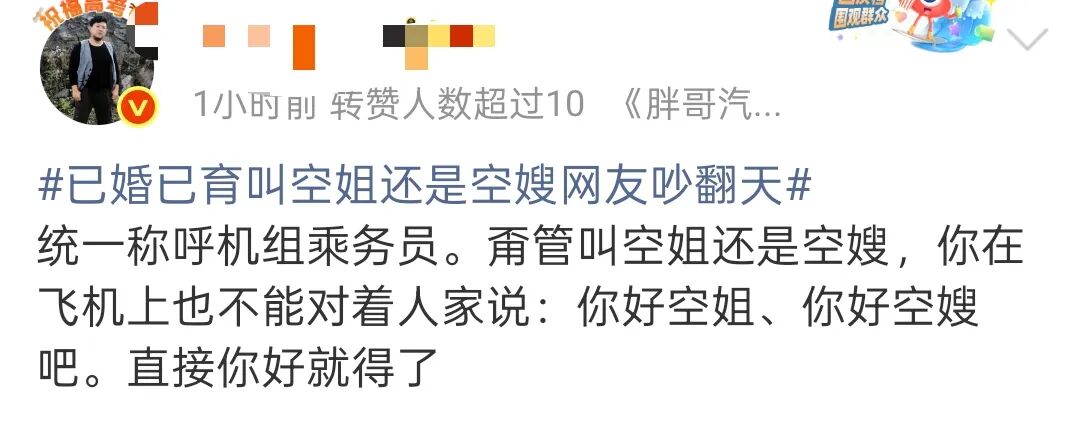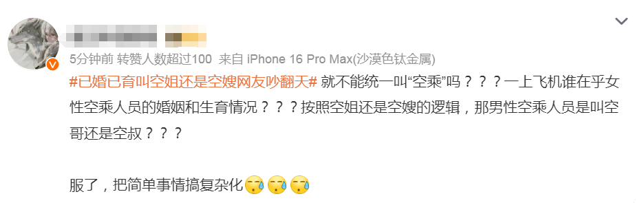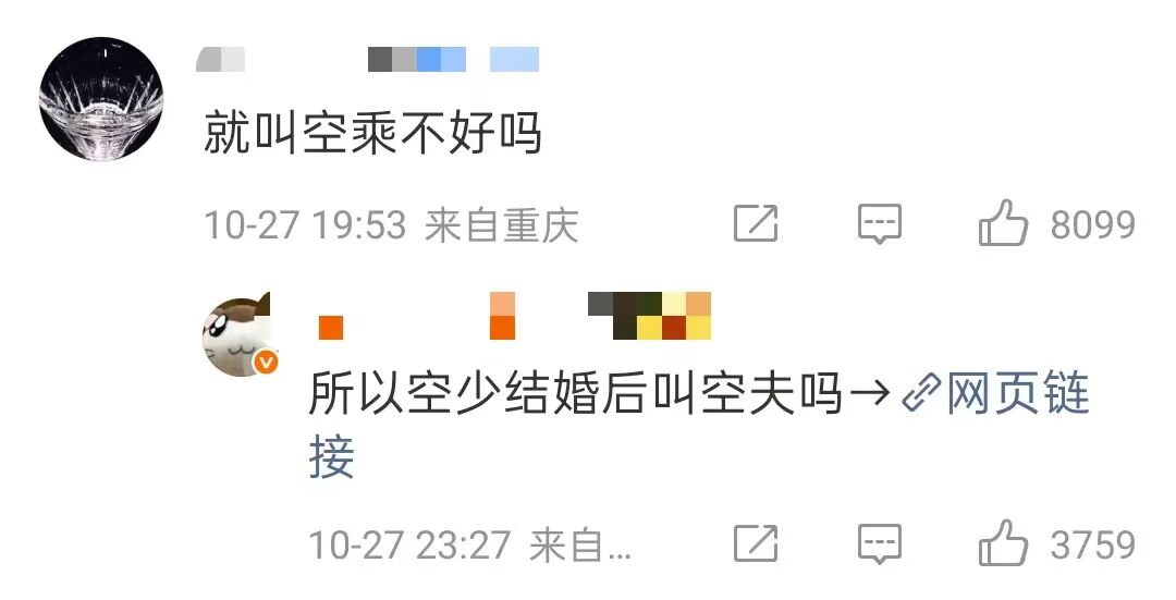 更有人直言:“按照空姐还是空嫂的逻辑,那男性空乘人员是叫空哥还是空叔?空少结婚后叫空夫吗?”