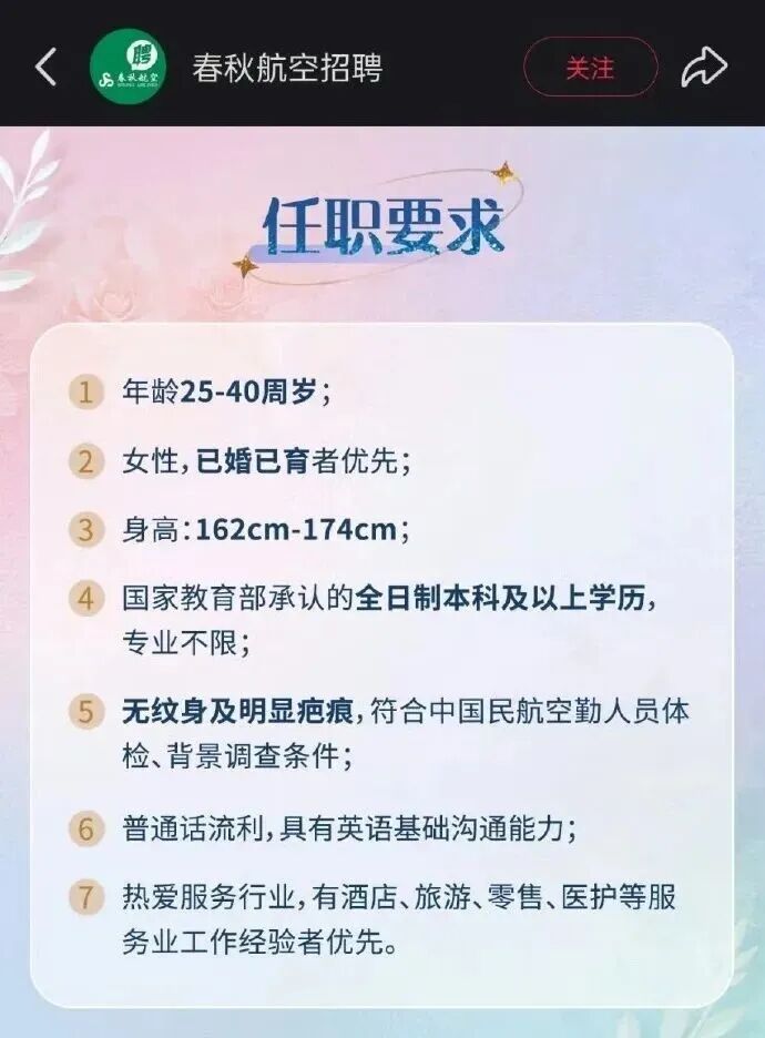 最引人注目的是,该岗位明确标注“已婚已育女性优先”,年龄限制放宽至40岁,这与传统空姐招聘通常设置在18-25周岁、部分航空公司放宽至28-32周岁的情况形成鲜明对比。