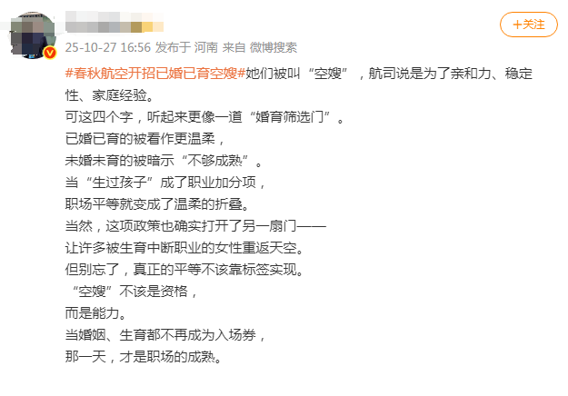 春秋航空这一突破,无疑为众多已婚已育女性重新踏入职场提供了新可能。网友纷纷点赞。