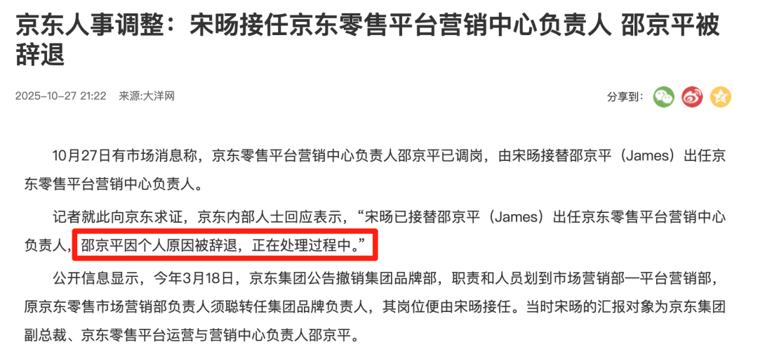 消息显示,京东零售平台营销中心负责人、集团副总裁邵京平因“个人原因”被辞退,其职位由宋旸接任。