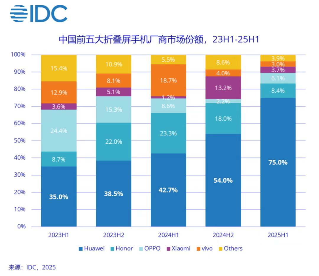 IDC的最新报告显示,2025年全球折叠屏出货量增速骤降至6%,中国市场渗透率虽从2021年的1%提升至8%,但相较于全年预计近3亿台的手机总出货量,仍属小众品类。更值得警惕的是市场结构,华为以75%的份额垄断中国市场,荣耀、三星等其他品牌在剩余空间激烈缠斗。这种“一超多弱”的格局在科技产品史上极为罕见,且集中度并非源于技术壁垒的绝对领先,更像是品牌溢价与营销造势的共同结果。