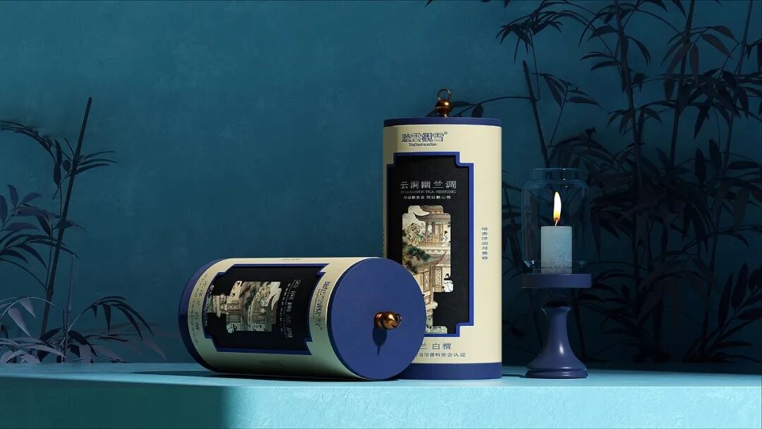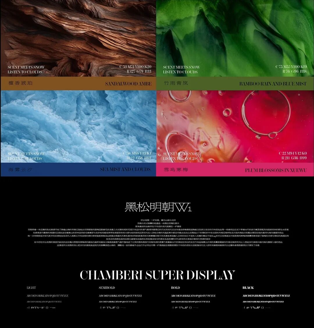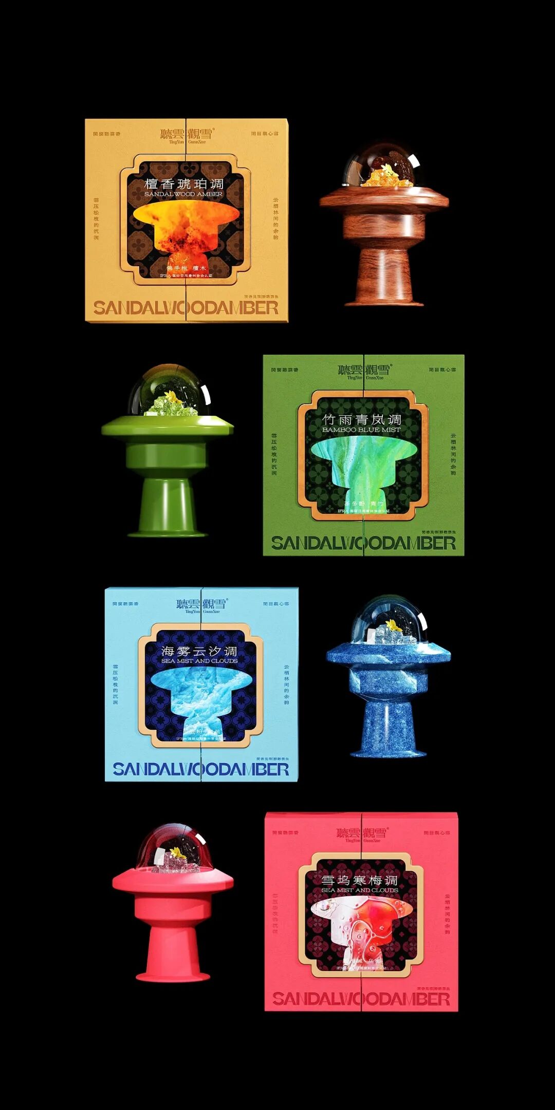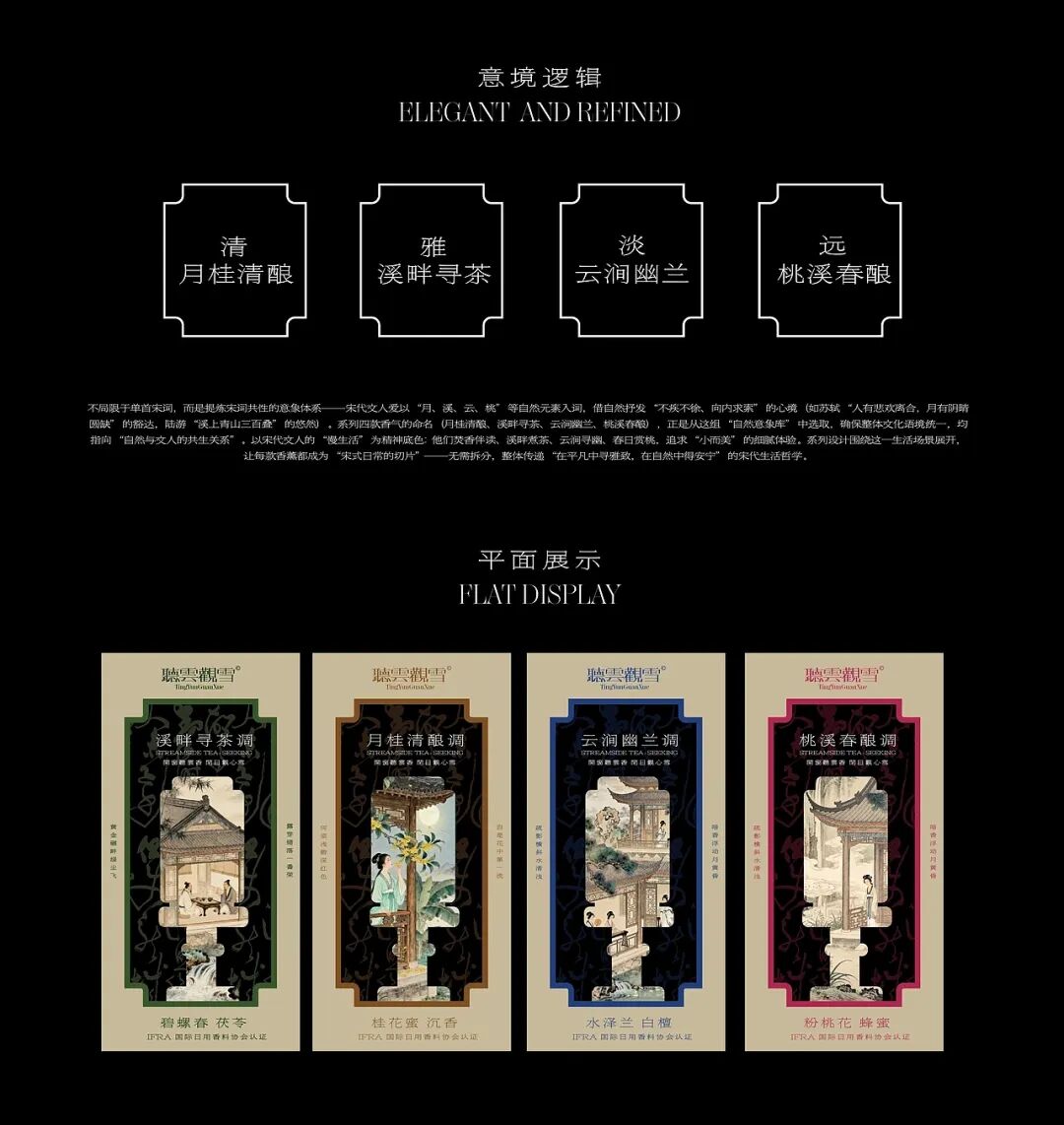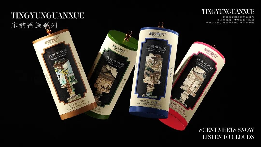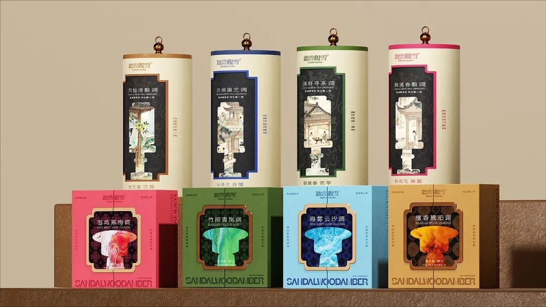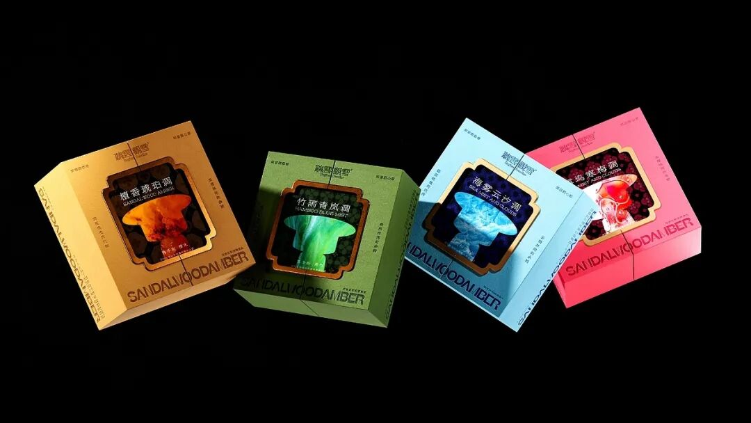 产品系列以 “闻檀、观海、品竹、赏梅” 四大中式文人行为为灵感,对应 “檀香琥珀调”“海雾云汐调”“竹雨青岚调”“雪坞寒梅调” 四款香氛。包装分别采用暖棕、浅蓝、墨绿、绯红的主色调,直观呼应香气的氛围,同时融入古典纹路元素,唤醒消费者对东方雅致生活的情感共鸣。