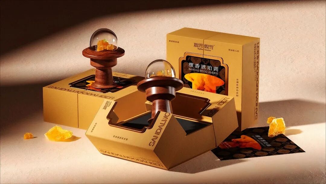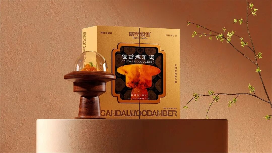 包装正面的镂空区域,呈现出香氛载体的艺术化剪影,将香氛的使用场景提前可视化。例如檀香琥珀调的包装中,琥珀色的香氛载体造型与暖棕包装、木质纹理的香氛器具形成呼应,让消费者未闻其香,先通过视觉感知到木质调+琥珀的醇厚质感,构建了完整的沉浸式体验。