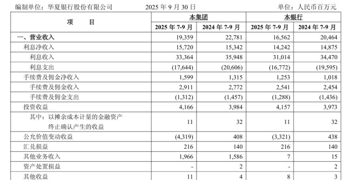 营收端的“增长焦虑”最为突出。2025年前三季度,华夏银行营业收入同比下降8.79%,其中利息净收入同比下降3.2%,非息收入同比下降21.5%,收入结构的脆弱性凸显。