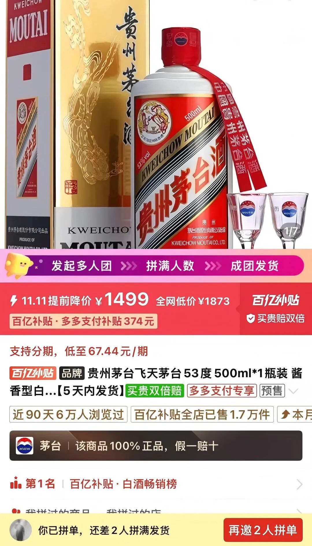 今年的超长双十一还在继续,而拼多多上一瓶53度飞天茅台的标价,已经悄悄跌到了1499元,开始与普通消费品的价格连线。