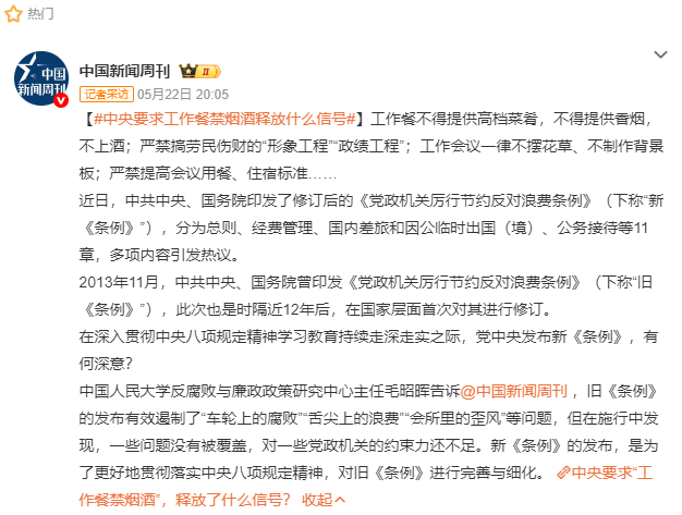 新版《党政机关厉行节约反对浪费条例》明确规定,公务接待的工作餐“不得提供高档菜肴,不得提供香烟,不上酒”,这彻底斩断了政务消费的尾巴。