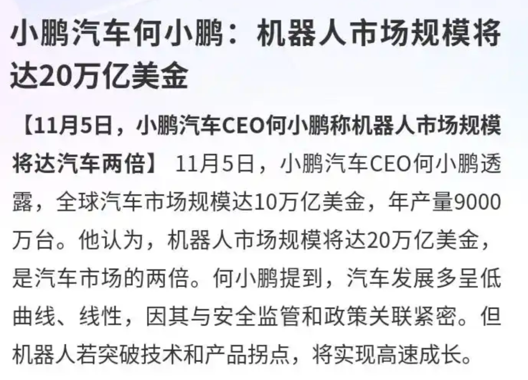 何小鹏在采访中这样说。他相信,5到10年后,机器人会像今天的汽车一样普及,甚至年销量会超过百万台。