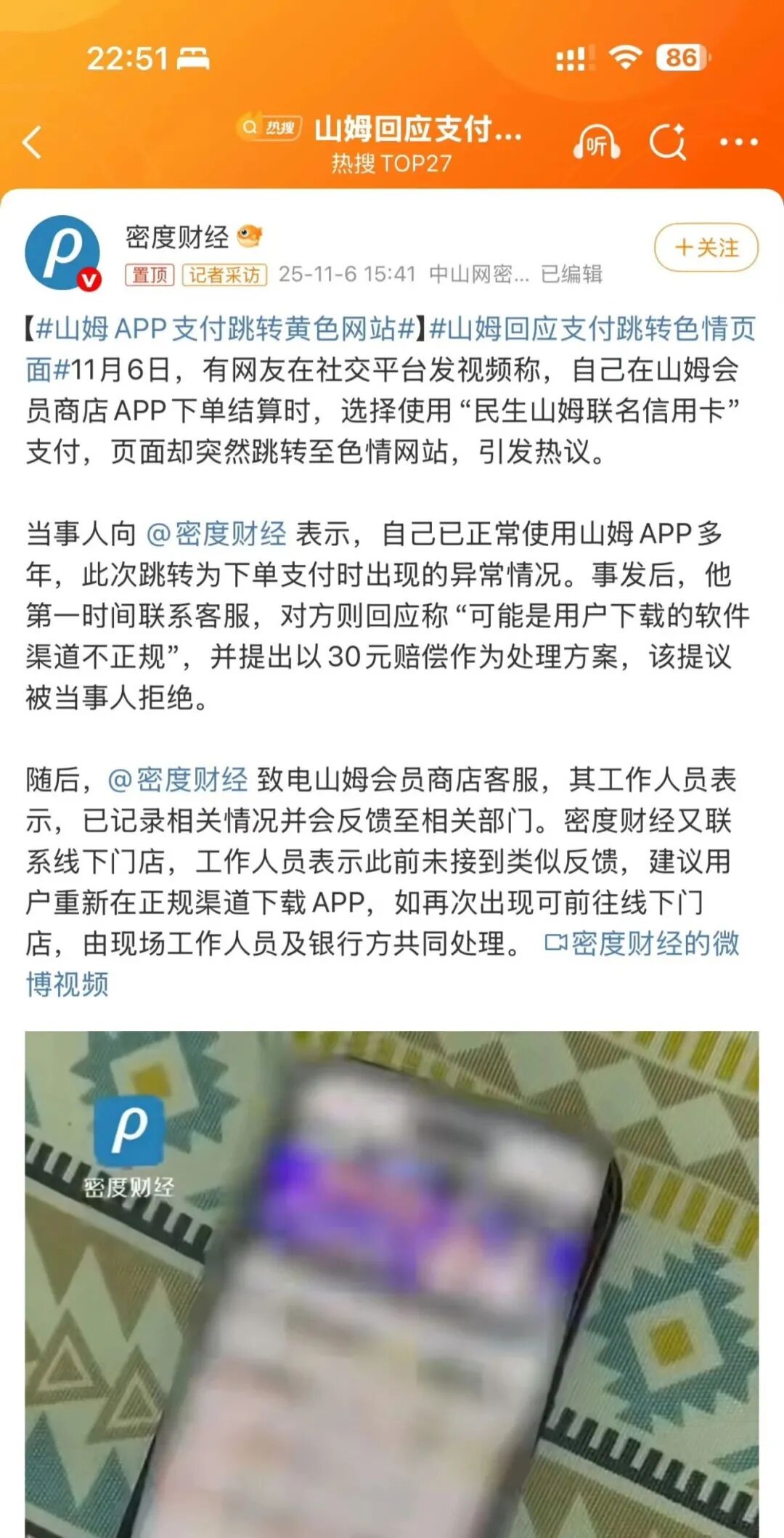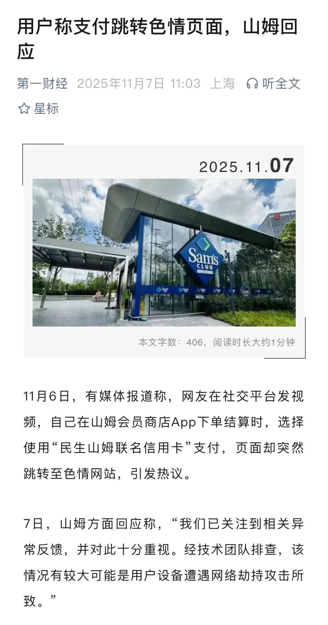 目前山姆的最新回应是,“我们已关注到相关异常反馈,并对此十分重视。经技术团队排查,该情况有较大可能是用户设备遭遇网络劫持攻击所致。”