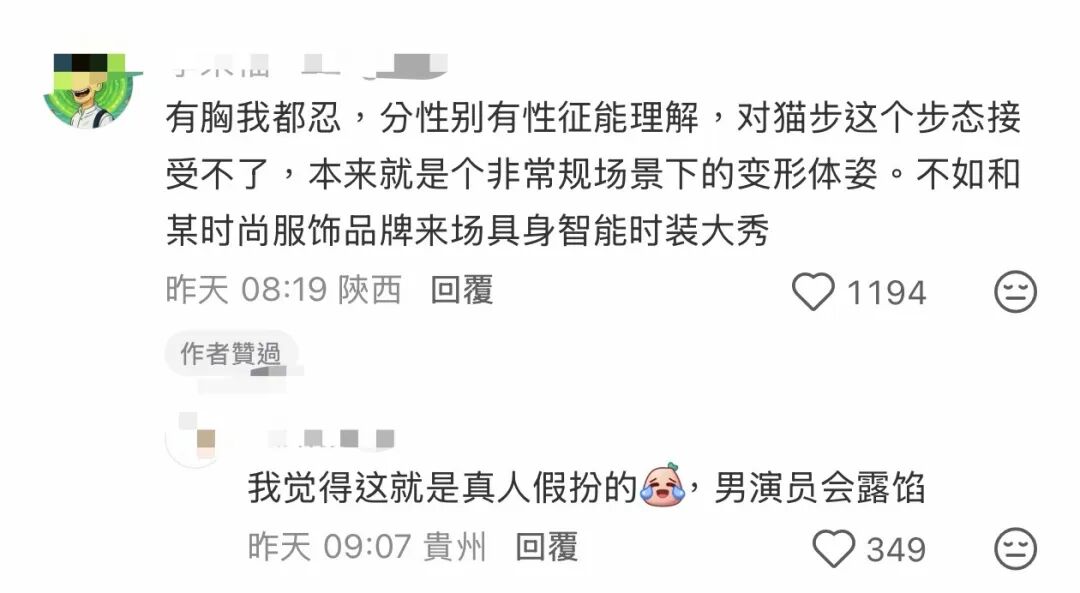 “有胸我都忍,分性别有性征能理解,对猫步这个步态接受不了,本来就是个非常规场景下的变形体姿。不如和某时尚服饰品牌来场具身智能时装大秀”