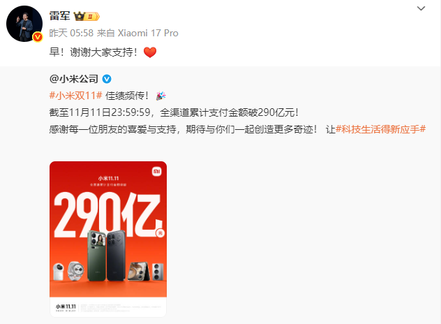 11月12日凌晨5点58分,雷军发了一条简短的动态——“早!谢谢大家支持”。