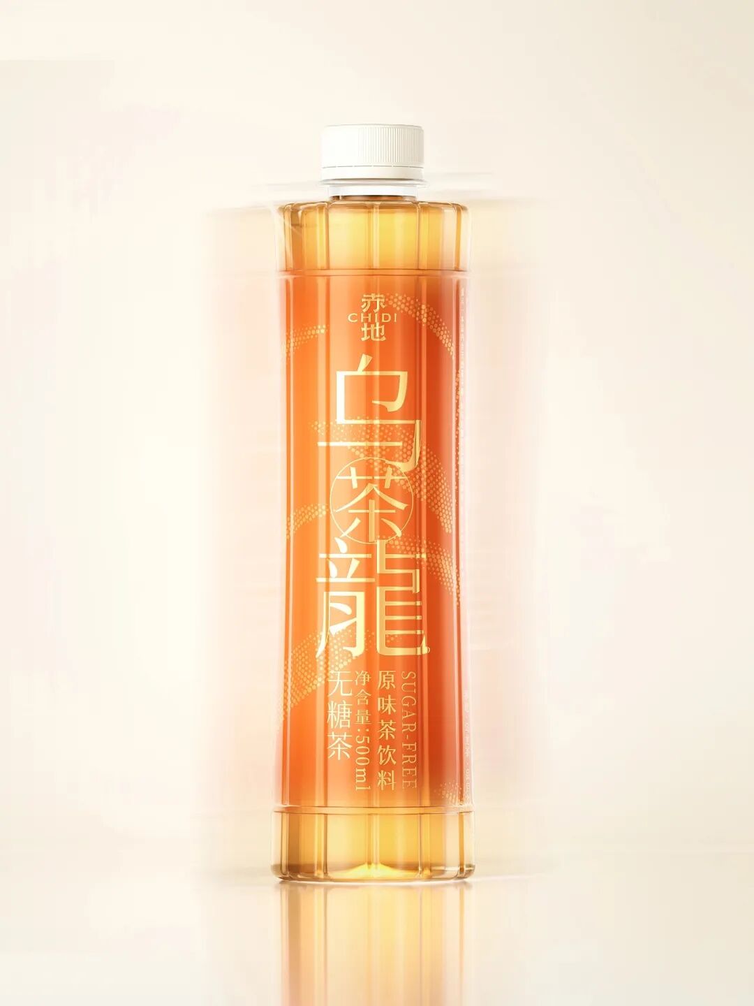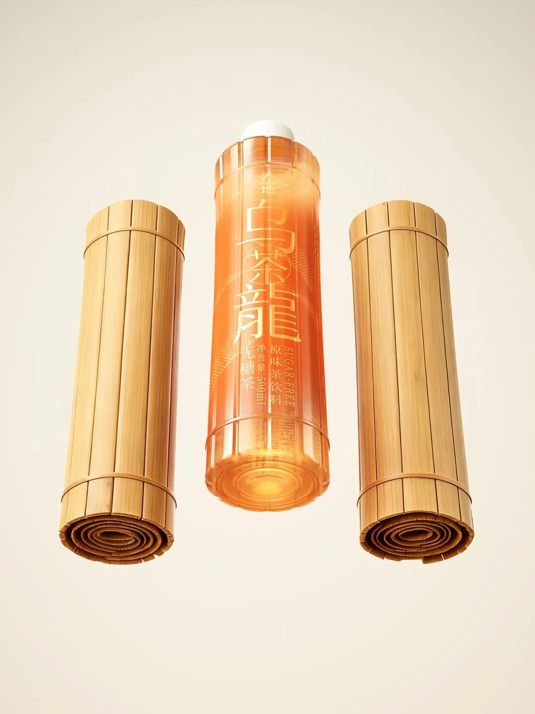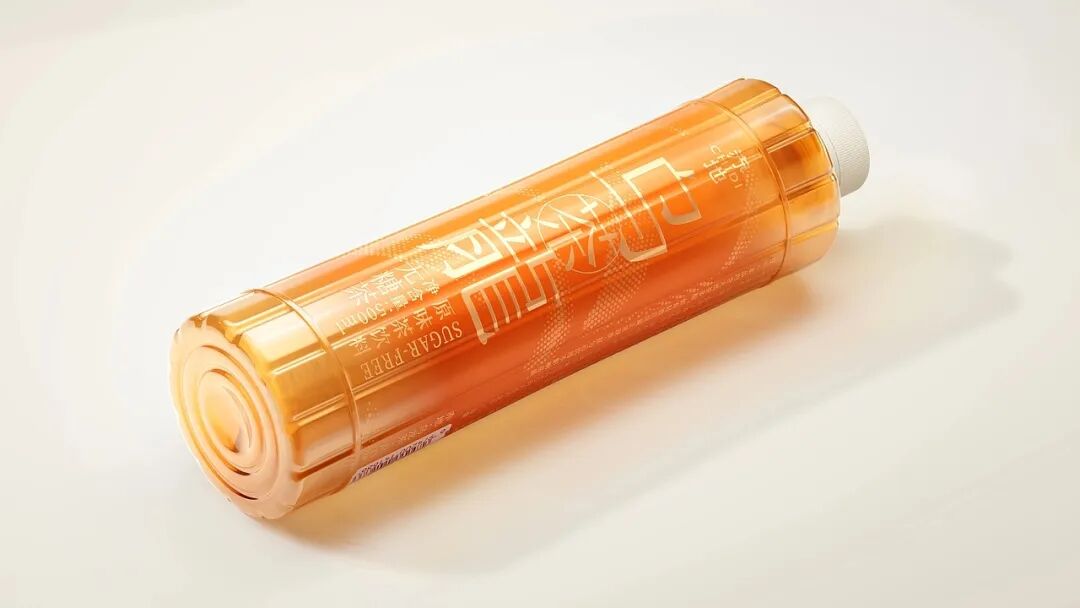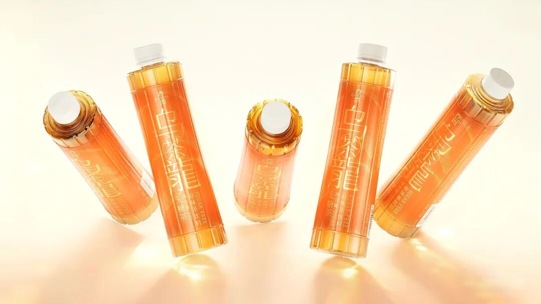因此瓶身外观融入竹简元素,竹简是东方文化的载体符号,承载着文学、历史等内容,而茶是东方生活方式的精神符号,二者都代表着慢、雅、自然的东方审美,将二者相结合,还原茶与竹器共生的场景,让茶饮回归到东方生活美学的一部分。此外,包装以暖橙为主色调,呼应茶液色泽,搭配金色的字体与茶纹装饰,让消费者在视觉上就能感受到茶的纯粹和文化的厚重。