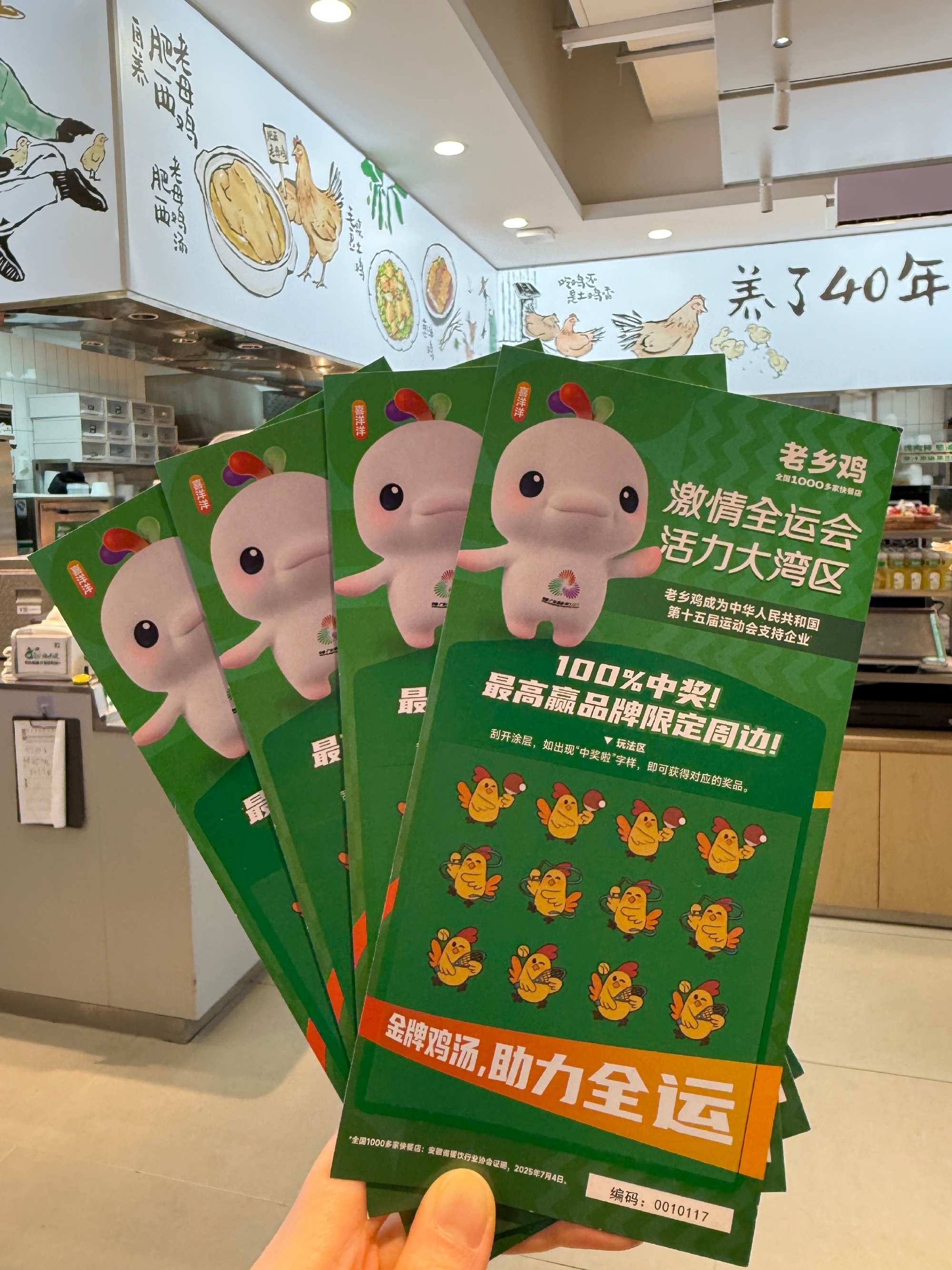 这次活动时间11 月 9 日-16 日,消费者在老乡鸡堂食满 29 元就送刮刮卡,100% 中奖率,正版吉祥物手办、乒乓鸡公仔、菜品券随便抽,还随餐赠送全运会定制贴纸。