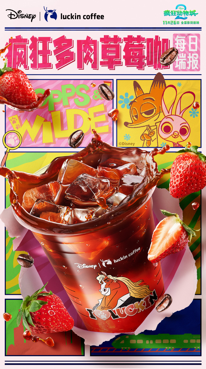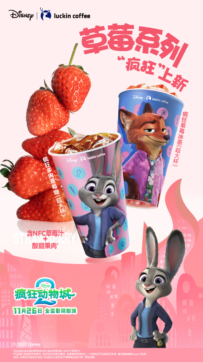 瑞幸咖啡与迪士尼动画电影《疯狂动物城2》的联名活动已于11月17日正式上线,推出两款草莓系列新品疯狂多肉草莓咖” 与 “疯狂草莓冰茶”以及多款限定周边。