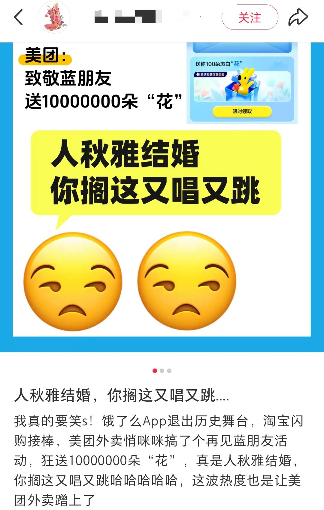 当媒体纷纷报道饿了么更名为“淘宝闪购”时,美团的“致敬”活动迅速分流了公众注意力,将部分关注度引向了自身。 “追悼会”“献花券”等概念极适配社交媒体二创,网友自发玩梗“好歹毒的商战”,助推话题破圈。