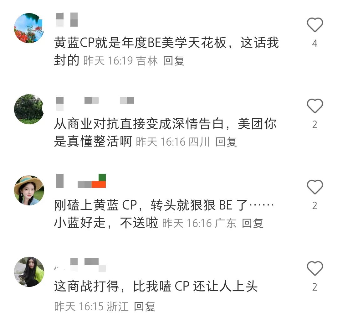 更有网友将美团和饿了么比作一对相爱相杀的 “冤家”,还有人磕起了黄蓝CP。