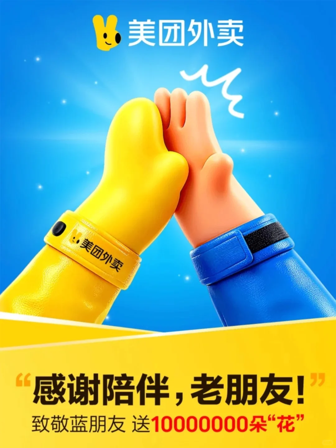 在活动页面的设计上,美团同样暗藏小心思。页面底部新增的 “致敬” 按钮,配图是一只黄色的手(代表美团)和一只蓝色的手(代表饿了么)在击掌,寓意着 “握手言和”。