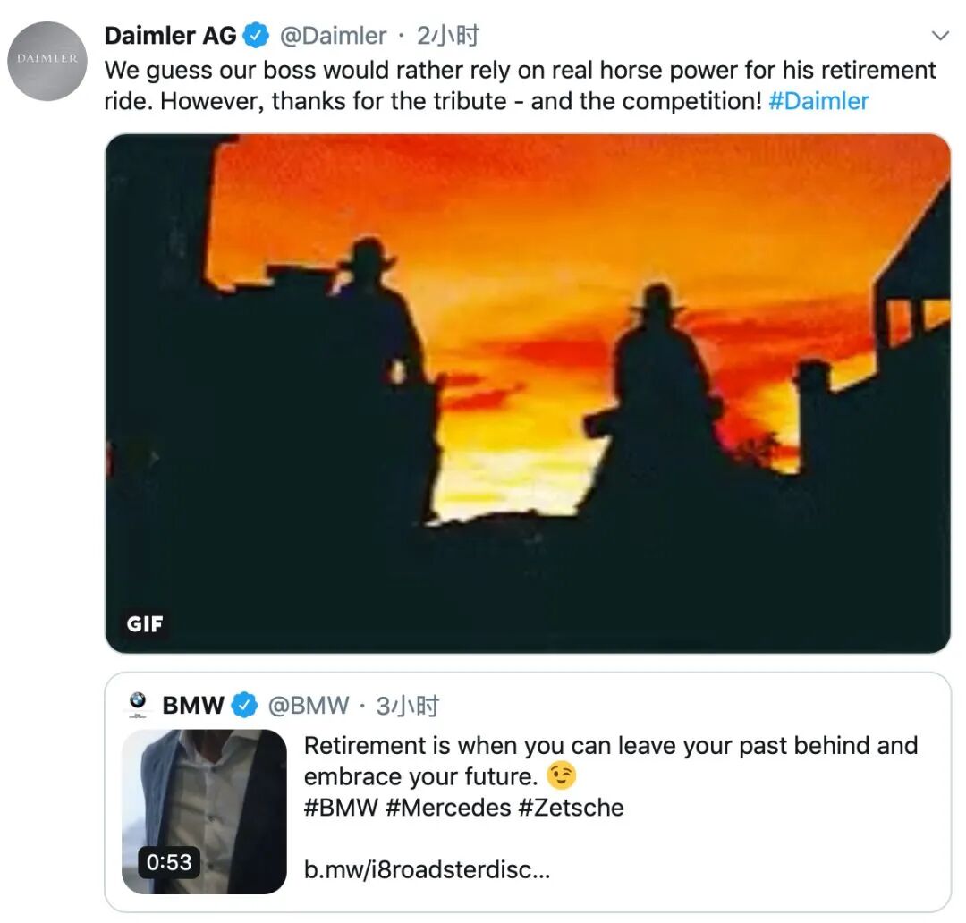 奔驰总裁退休时,宝马拍视频祝他“终于能开宝马”,奔驰回怼“我们老板宁愿骑马”也不要宝马 。