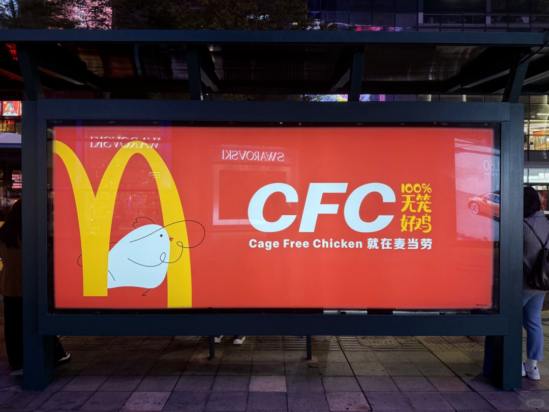 麦当劳宣传自己使用非笼养殖的 “无笼好鸡”(CFC),强调动物福利和鸡肉品质,海报还常常出现在肯德基门店附近,直接“贴脸开大”。