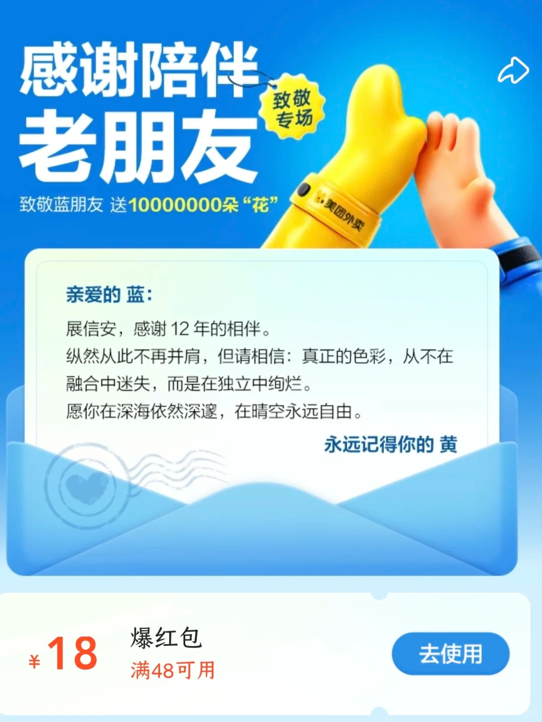 最重要的是,美团通过这场活动,悄然完成了自身市场地位的强化。“感谢12年的相伴”暗示了美团在市场竞争中的持久力;“不再并肩”则隐晦地指向了饿了么的“退场”。